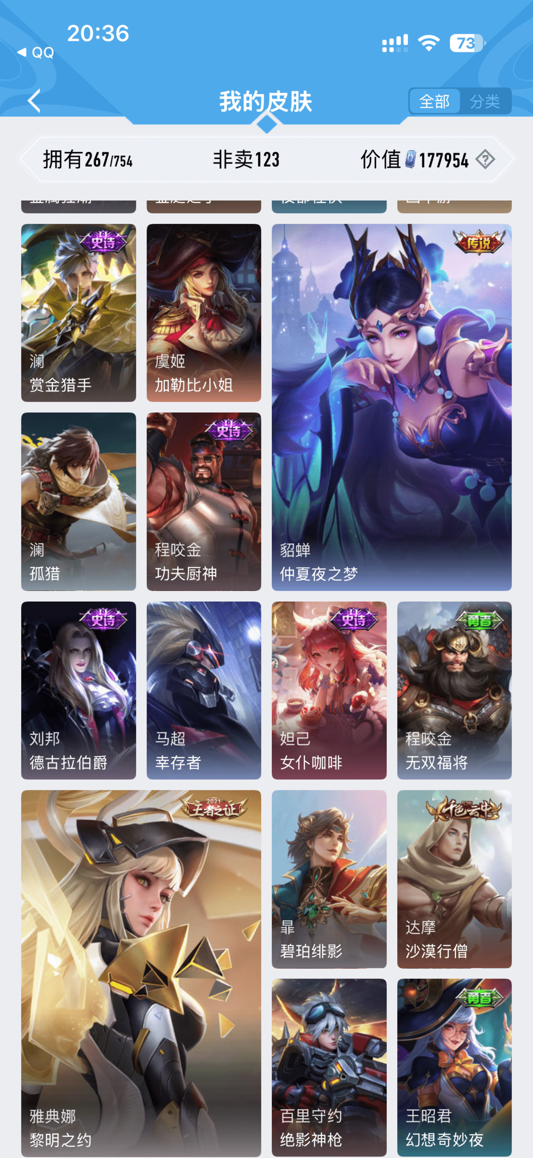 貂蝉(貂蝉 仲夏夜之梦,貂蝉 异域舞娘);李信(李信 灼热之刃);吕布(吕布 末日机甲,吕布 圣诞狂欢,吕布 野性能量,吕布 猎兽之王);妲己(妲己 女仆咖啡,妲己 魅力维加斯,妲己 少女阿狸);钟馗(钟馗 驱傩正仪,钟馗 地府判官,钟馗 虚灵犬护);刘禅(刘禅 秘密基地,刘禅 绅士熊喵,刘禅 唤灵魔甲);干将莫邪;韩信(韩信 逐梦之影,韩信 街头霸王,韩信 教廷特使,韩信 弑枪猎影);墨子(墨子 金属风暴,墨子 神迹守卫,墨子 龙骑士,墨子 进击墨子号);孙尚香(孙尚香 末日机甲,孙尚香 水果甜心,孙尚香 沉稳之力);盾山(盾山 御銮,盾山 圆桌骑士);狄仁杰(狄仁杰 锦衣卫,狄仁杰 魔术师,狄仁杰 万华元夜,狄仁杰 鹰眼统帅,狄仁杰 超时空战士,狄仁杰 阴阳师);王昭君(王昭君 幻想奇妙夜,王昭君 精灵公主,王昭君 偶像歌手);马可波罗(马可波罗 激情绿茵,马可波罗 暗影游猎);孙策(孙策 猫狗日记);夏侯惇(夏侯惇 乘风破浪,夏侯惇 朔风刀);后羿(后羿 神树通天,后羿 阿尔法小队,后羿 完美运算);张飞(张飞 乱世虎臣,张飞 五福同心);孙悟空(孙悟空 西部大镖客,孙悟空 至尊