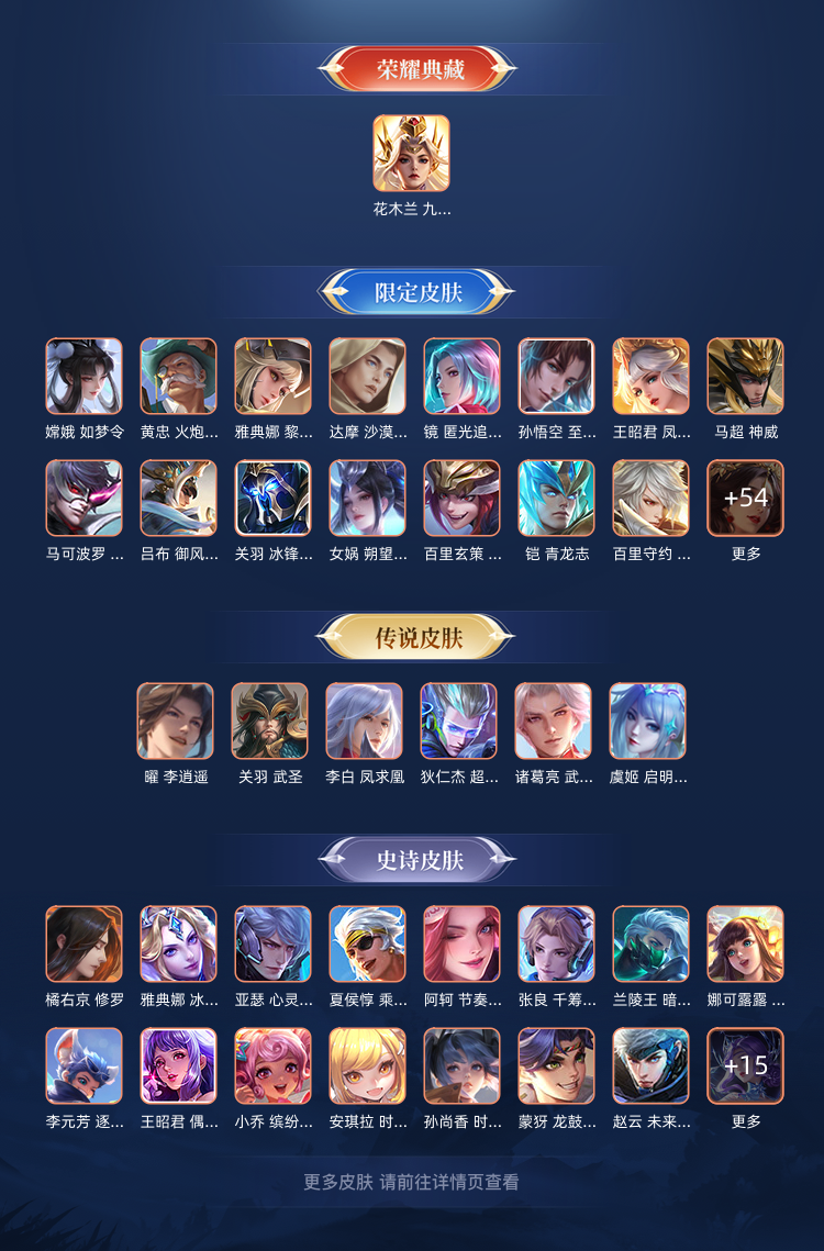 退游号,有玄策白虎志,凯青龙志,守约朱雀志,关羽武圣,冰封战神,孙悟空大圣娶亲,至尊宝,露娜一生所爱,紫霞仙子,貂蝉猫影幻影,安琪拉魔法厨娘,雅典娜神奇女侠,西施游龙清影,诸葛亮武林仙君,李白凤求凰,王昭君凤凰于飞,阿离夏日皮肤是,马超神威,橘右京修罗,娜可露露晚萤,嫦娥如梦令,韩信飞衡,马克kpl,曹操kpl,项羽虞姬霸王别姬,妲己时之彼瑞,花木兰典藏皮肤情人节皮肤等其他皮肤
