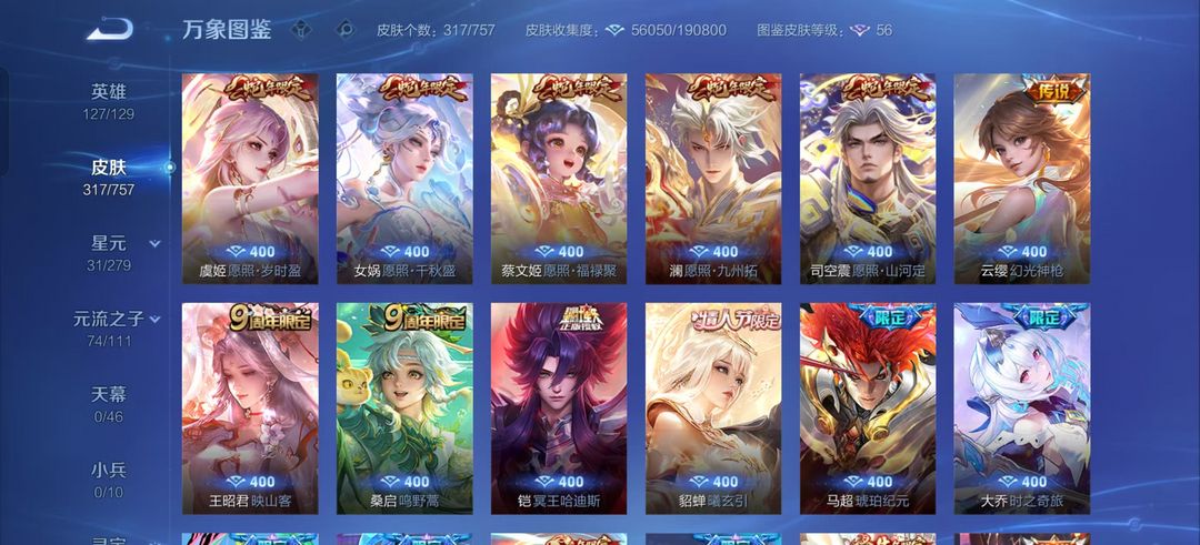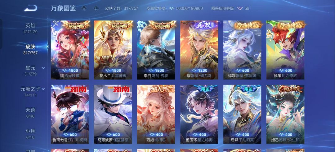 317皮肤-鸣剑·曳影 九霄神辉 器灵·螭龙剑 祈雪灵祝 山海·炽霜斩 愿照·九州拓 江户川柯南 怪盗基德 琥珀纪元(马超) 时之奇旅(孙策