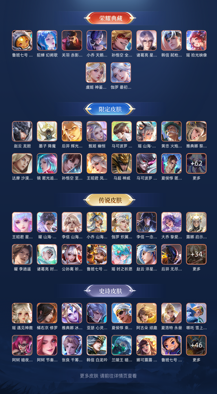 族无双10 荣耀典藏11 无双8 珍品传说7 传说皮肤114 史诗皮肤222 皮肤数量627