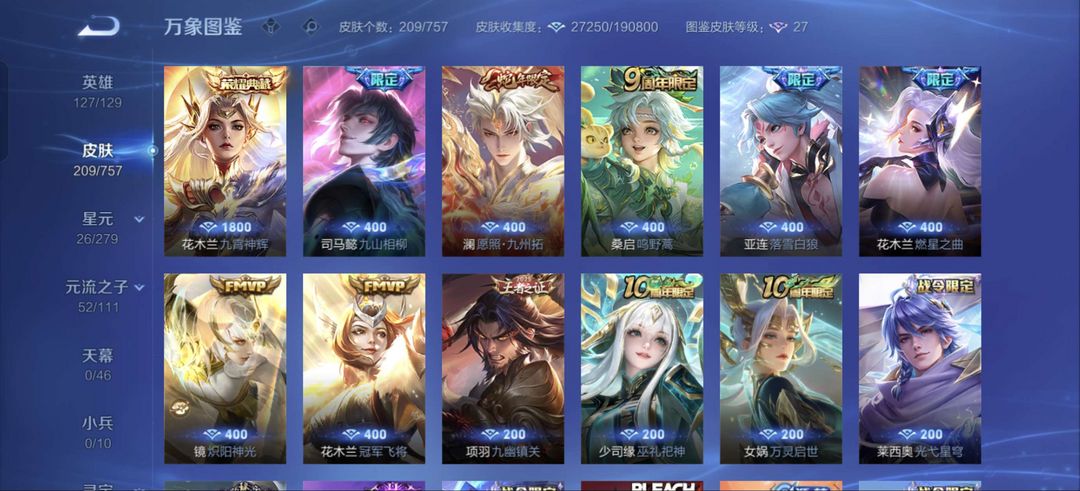 总共209个皮肤,V7,万战花木兰,满级铭文。