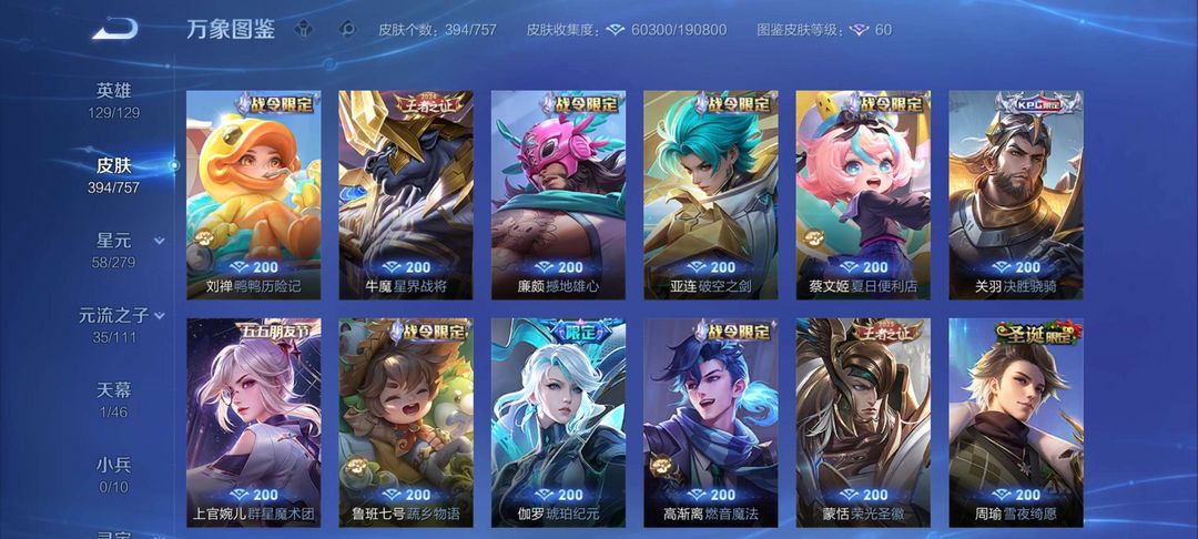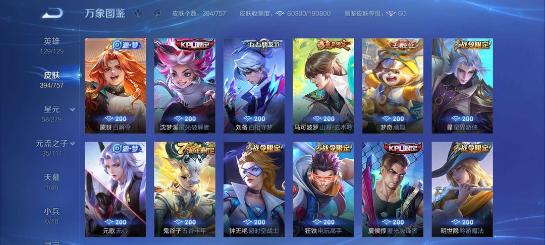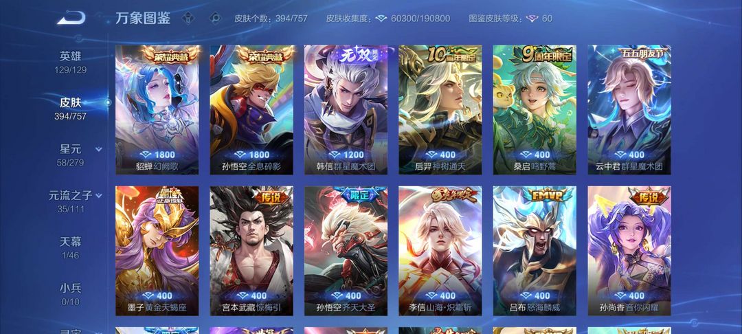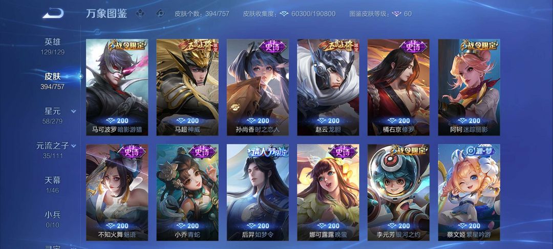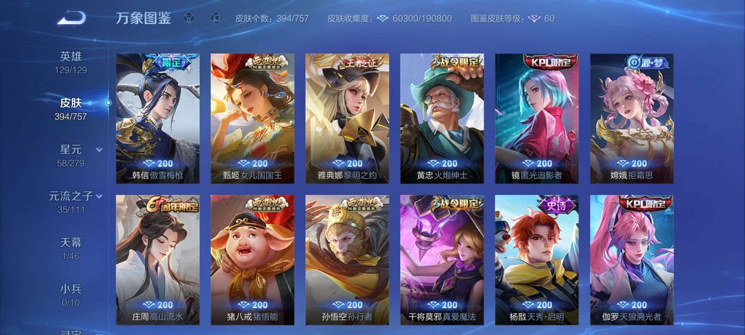 全英雄 皮肤数量394 稀有皮肤如图所示 历史 海诺小国标