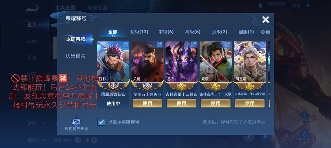 2月在榜国服狂铁⚡万强巅峰对抗路⚡小国关羽⭐1w7国服元歌⚡国服吕布⚡省吕布司空震❤️可排位禁巅峰