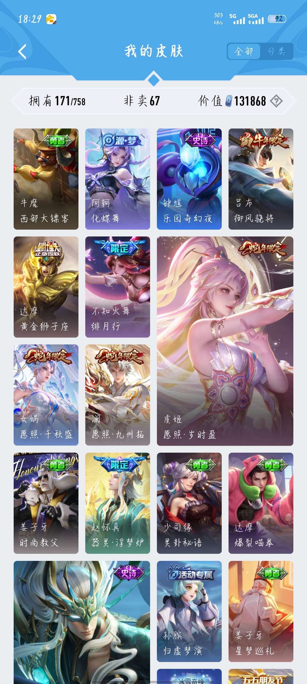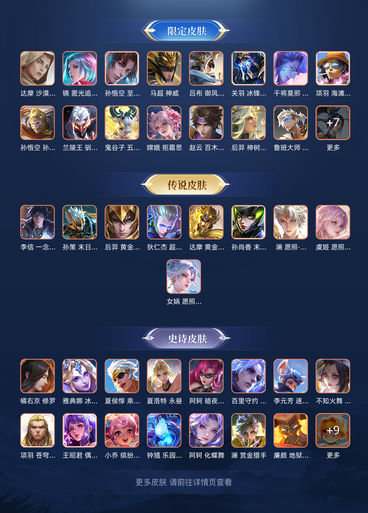1.3万极品库存号 马超神威干将冰霜恋舞曲花木兰冠军飞将等超多精品皮肤