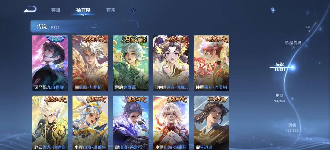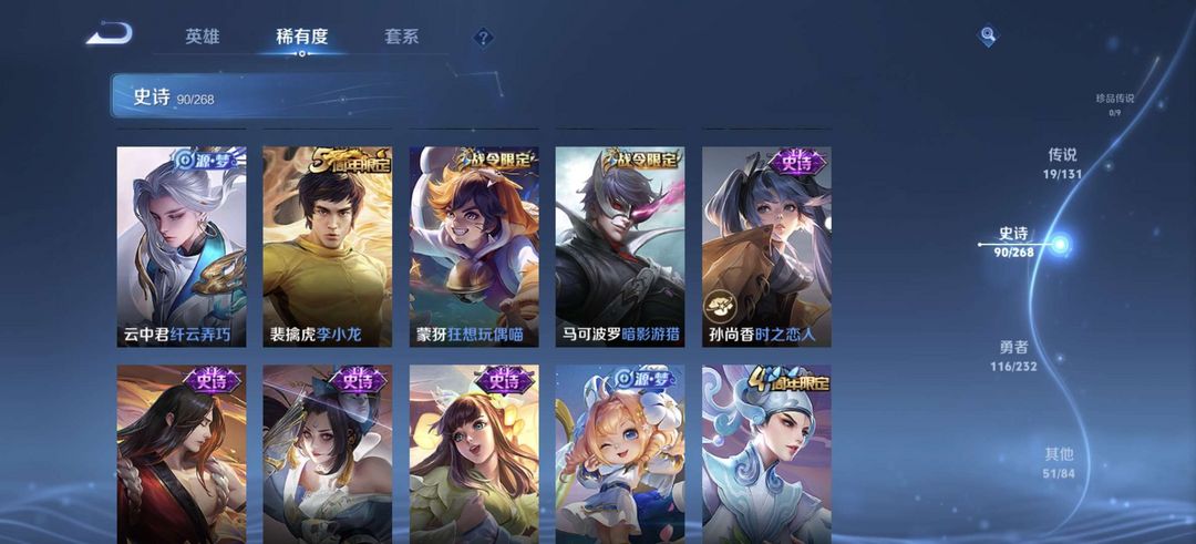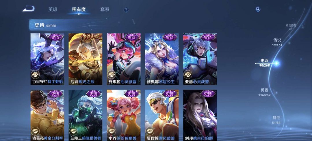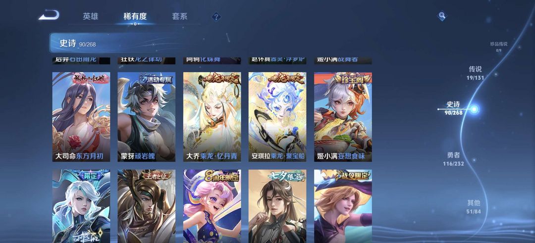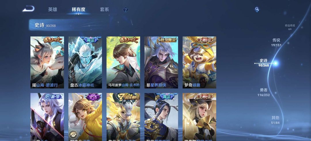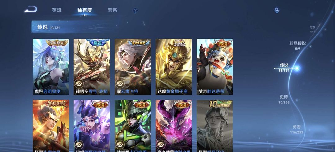 贵族8,278皮肤,一无双,一典藏,19传说,曜全皮,10印记,可排位