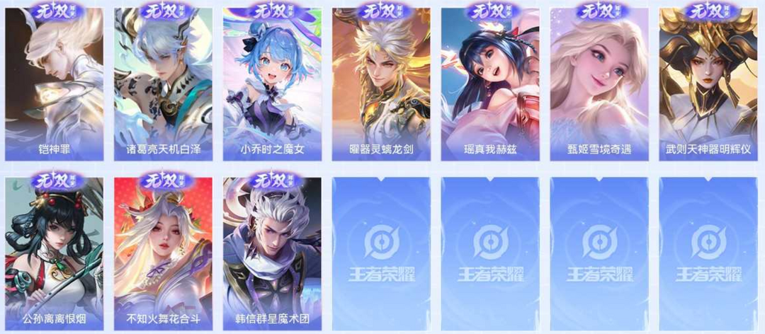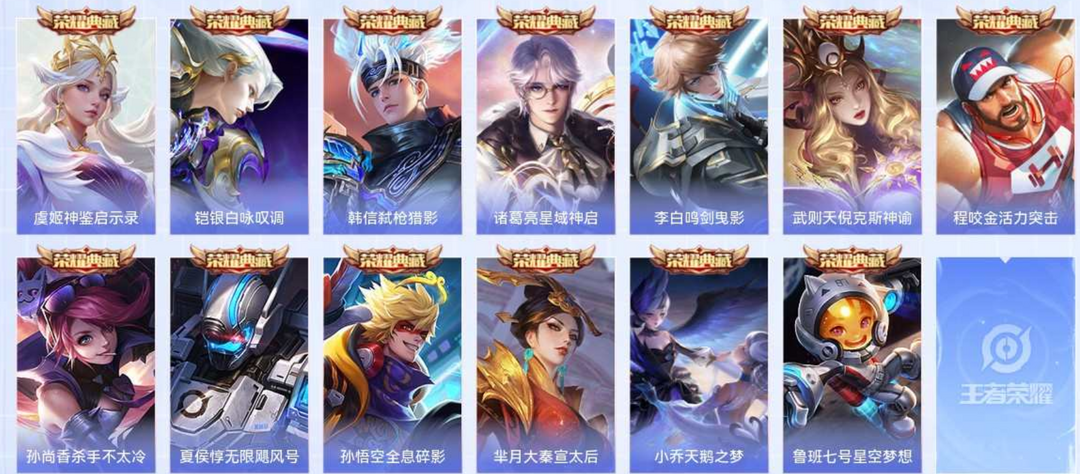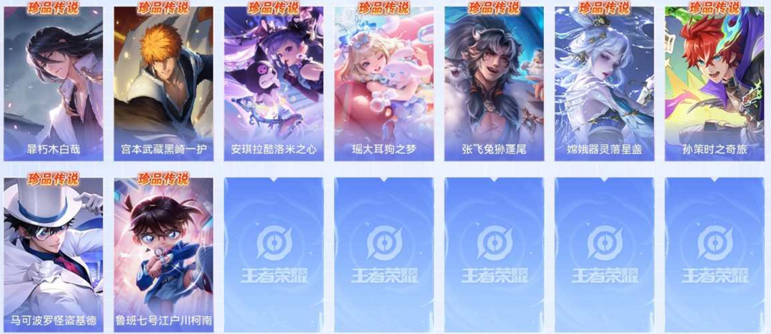 珍品传说9 无双10 典藏13 传说103 史诗236 限定305 英雄129 皮肤676 11 贵族无双级 【珍品传说9】 暃朽木白哉 宫本武藏黑崎一护 安琪拉酷洛米之心 瑶大耳狗之梦 张飞兔狲蓬尾 嫦娥器灵落星盏 孙策时之奇旅 马可波罗怪盗基德 鲁班七号江户川柯南 【无双皮肤10】 铠神罪 诸葛亮天机白泽 小乔时之魔女 曜器灵螭龙剑 瑶真我赫兹 甄姬雪境奇遇 武则天神器明辉仪 公孙离离恨烟 不知火舞花合斗 韩信群星魔术团 【荣耀典藏13】 虞姬神鉴启示录 铠银白咏叹调 韩信弑枪猎影 诸葛亮星域神启 李白鸣剑曳影 武则天倪克斯神谕 程咬金活力突击 孙尚香杀手不太冷 夏侯惇无限飓风号 孙悟空全息碎影 芈月大秦宣太后 小乔天鹅之梦 鲁班七号星空梦想