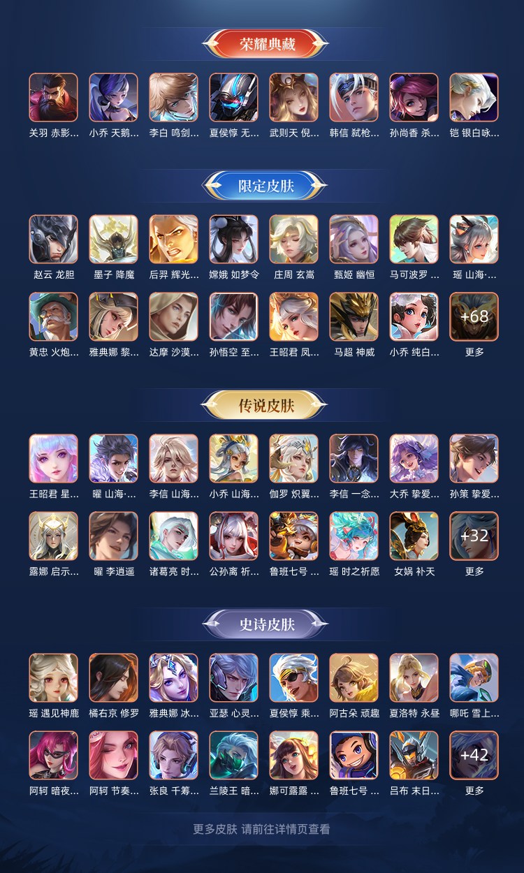 天魔缭乱/至尊宝/热情桑巴/青龙志/朱雀志/久胜战神/飞衡/神器·明辉仪/鸣剑·曳影/乘龙·问璇玑/时之奇旅(大乔)/赤影疾锋/时之奇旅(鲁班七号)/无双飞将/至美·化雀舞/时之祈愿瑶/遇见神鼓/李逍遥/逐花归海/琥珀纪