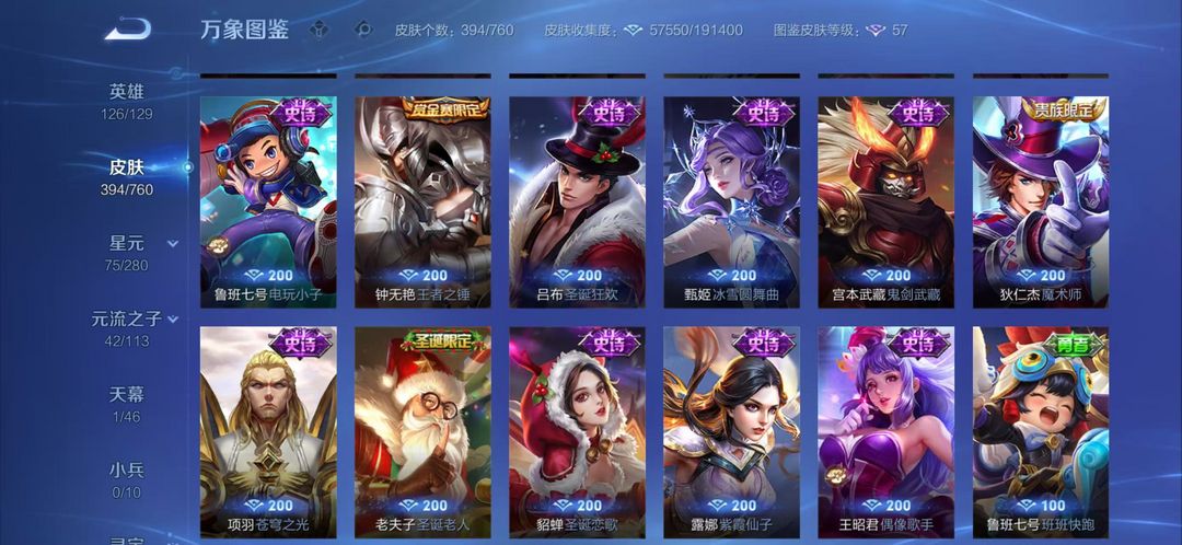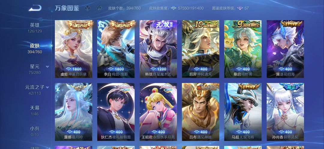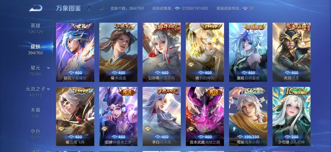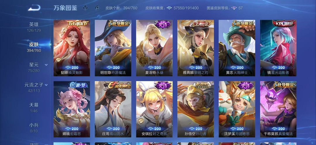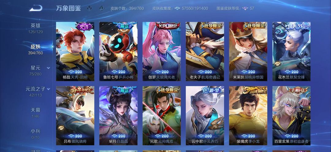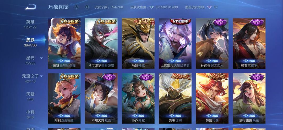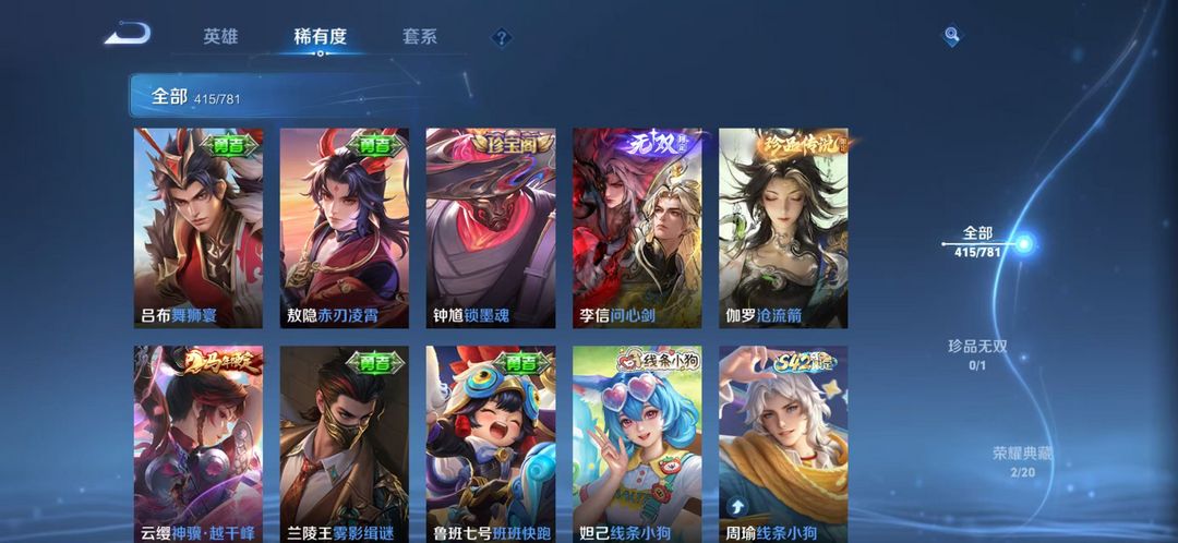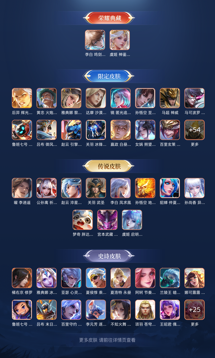可排位*415皮肤*韩信李信伽罗三无双*李白虞姬荣耀典藏神威至尊宝等众多限定