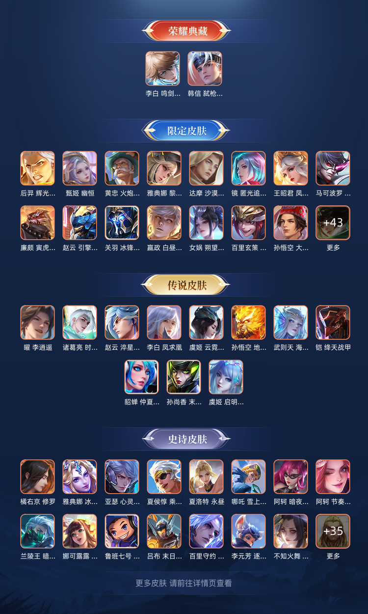 【传说皮肤】启明星使 虞姬,云霓雀翎 虞姬,逐花归海 澜,白虎志 百里玄策,地狱火 孙悟空,凤求凰 李白,仲夏夜之梦 貂蝉,海洋之心 武则天,时雨天司 诸葛亮,炽阳神光 镜,乞巧织情 王昭君,末日机甲 孙尚香,淬星耀世 赵云,绛天战甲 铠,寅虎·赤拳 裴擒虎,冠军飞将 花木兰,