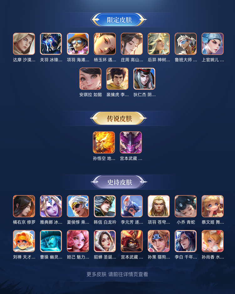 地狱之眼 地狱火 冰封战神 千年之狐 苍穹之光 高山流水 九幽镇关 白龙吟 幽灵船长 暗都幽影 青蛇 猫狗日记(孙策) 满铭文132皮肤