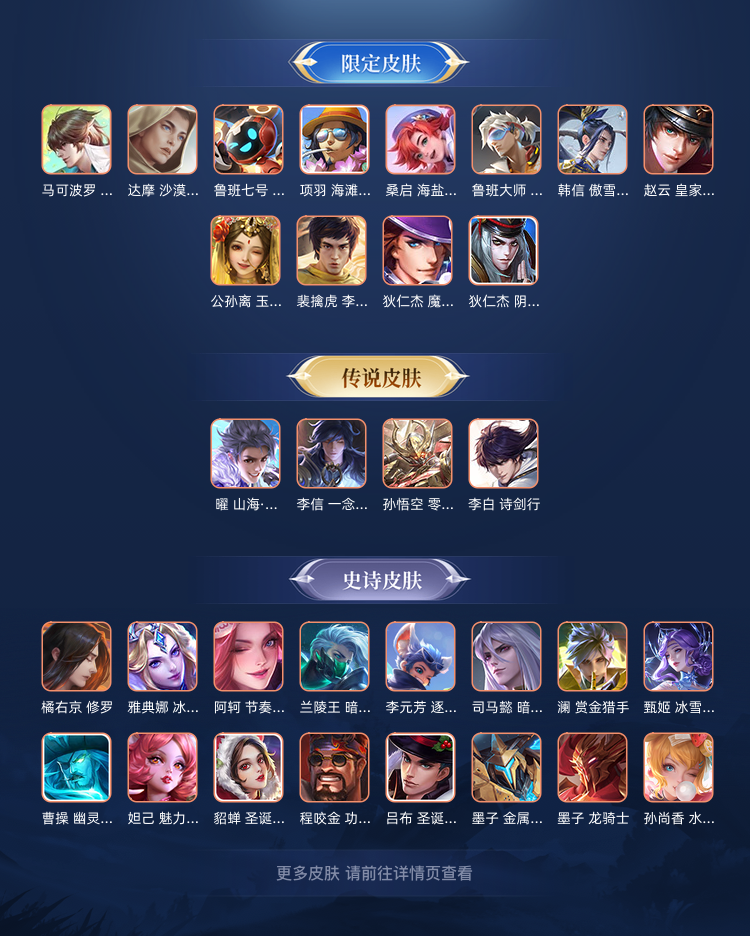 山海·玄木吟,马可波罗 激情绿茵);孙悟空(孙悟空 零号·赤焰);李信(李信 一念神魔,李信 灼热之刃);吕布(吕布 遇见神鼓,吕布 圣诞狂欢);兰陵王(兰陵王 影龙天霄,兰陵王 暗隐猎兽者,兰陵王 金庭之子);曜(曜 山海·苍雷引,曜 归虚梦演);花木兰(花木兰 剑舞者,花木兰 兔女郎);宫本武藏(宫本武藏 惊梅引);