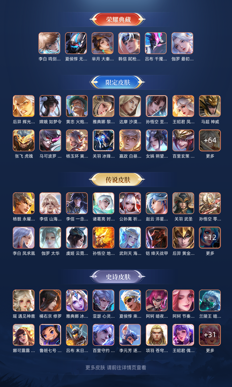各种无双皮肤,各种年限皮肤,荣耀王者段位。各种皮肤都有,400多个皮肤