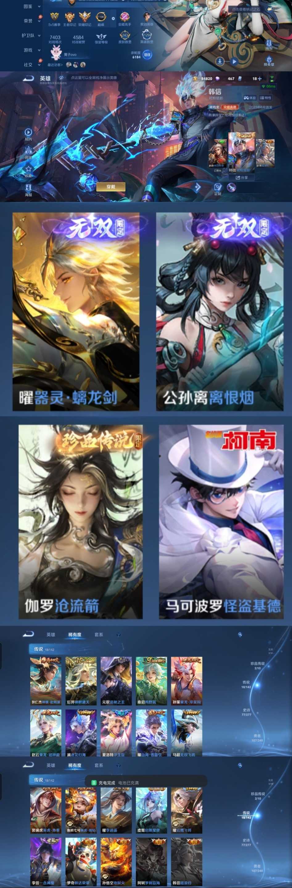 该号英雄129个皮肤243个,典藏1个,无双2个,珍品传说2个,星传说1个,传说18个,史诗77个,祝您游戏愉快~