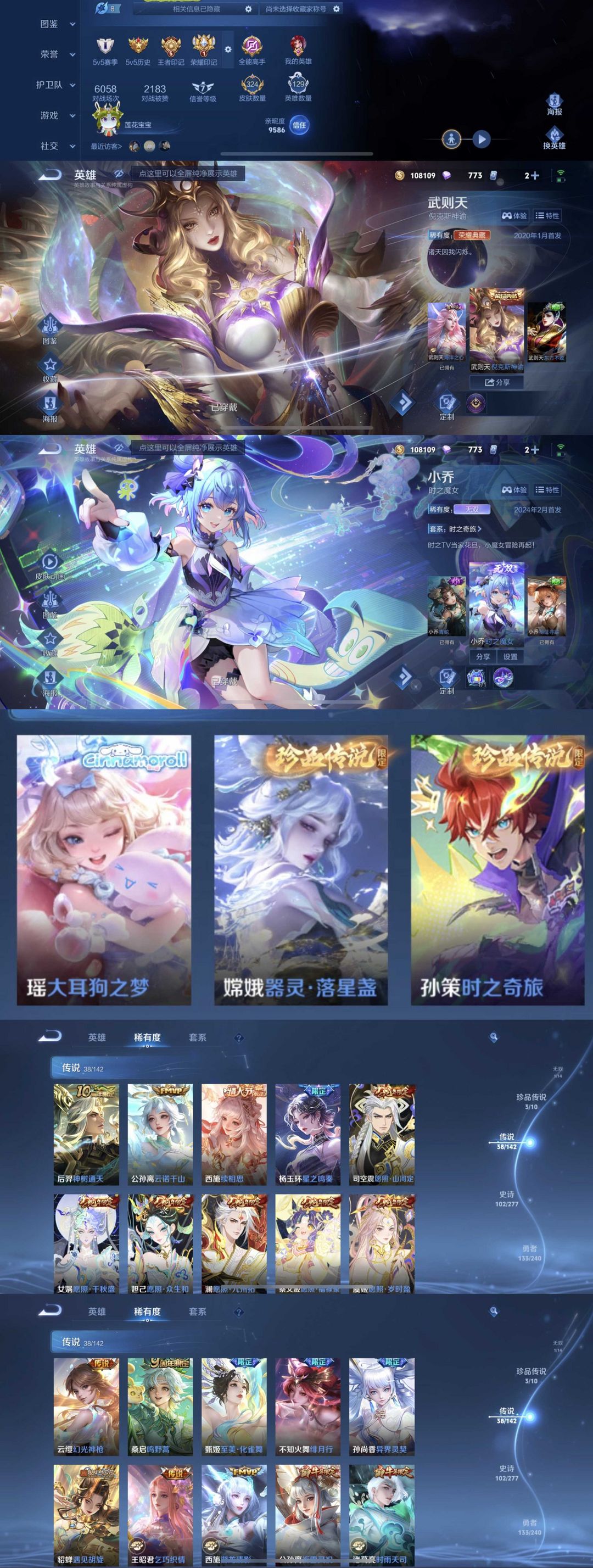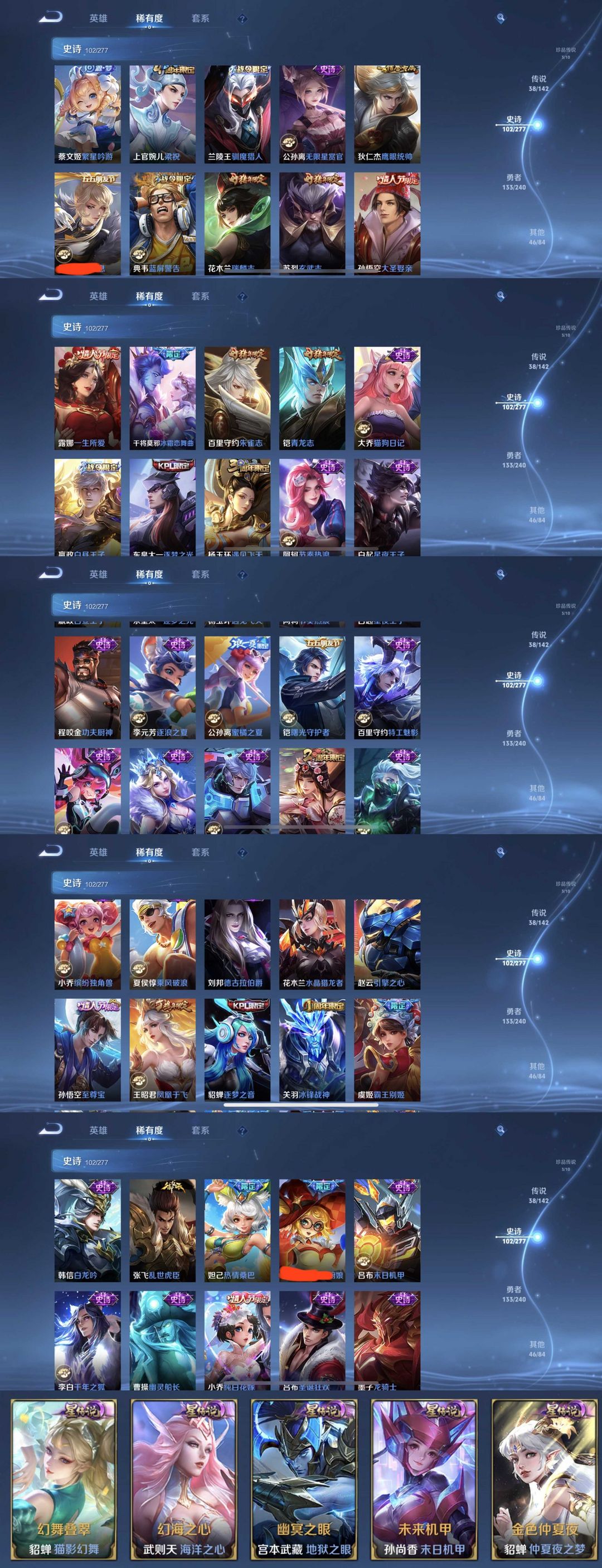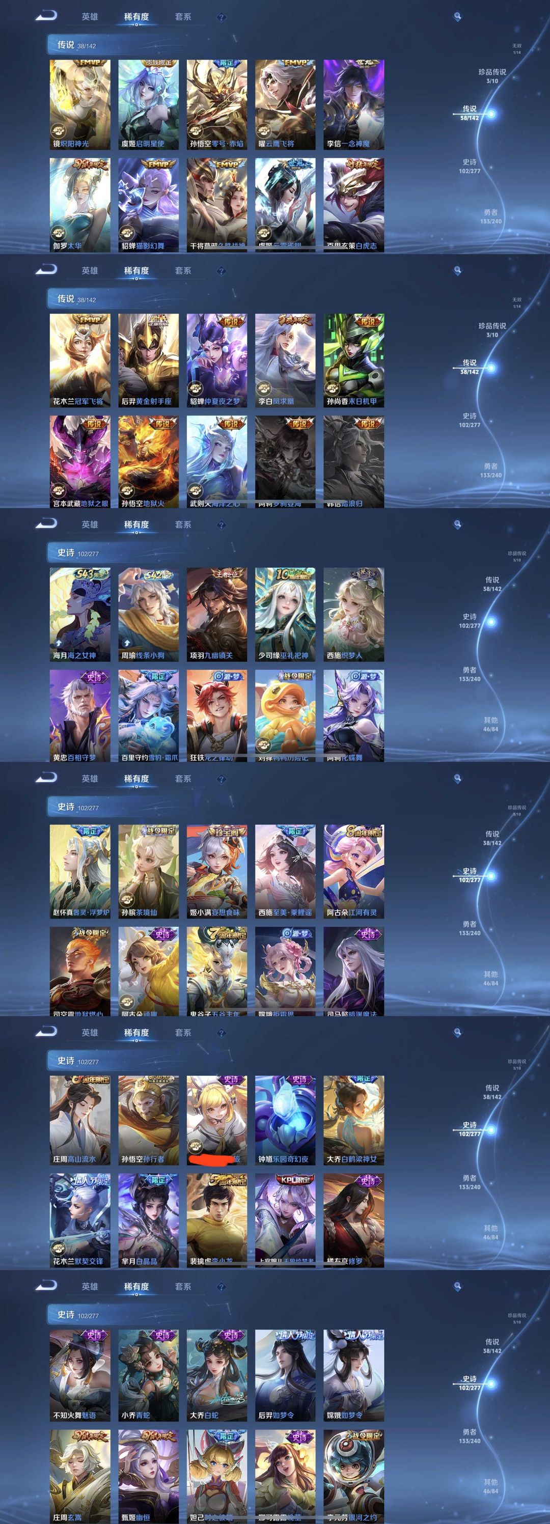 该号英雄129个皮肤324个,典藏2个,无双1个,珍品传说3个,星传说5个,传说38个,史诗102个,祝你游戏愉快~