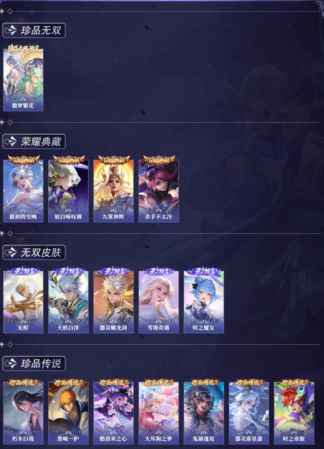 无相天机白泽馥梦繁花✨全蛇限23年限✨4水1珍无双5无双7珍传55传23年限3星元138史诗#酷洛米之心✨黑崎一护兔狲蓬尾✨时之奇旅器灵落星盏✨大耳狗之梦朽木白哉✨孙悟空_无相 诸葛亮_天机白泽 曜_器灵螭龙剑 甄姬_雪境奇遇 小乔_时之魔女伽罗_最初的交响 铠_银白咏叹调 花木兰_九霄神辉 孙尚香_杀手不太冷王昭君_长夜焕生 杨戬_纵目迁山 后羿_神树通天 元歌_诡秘之主 大司命_死亡执政官 司马懿_九山相柳 公孙离_云诺千山 西施_续相思 杨玉环_星之鸣奏 云缨_幻光神枪 司空震_愿照山河定 虞姬_愿照岁时盈 蔡文姬_愿照福禄聚 妲己_愿照众生和 澜_愿照九州拓 后羿_千劫归真 女娲_愿照千秋盛 裴擒虎_祥瑞亨通 嬴政_玄雷天君 裴擒虎_寅虎赤拳 公孙离_祈雪灵祝 伽罗_太华 百里玄策_白虎志 杨戬_永曜之星 李白_凤求凰 大乔_挚爱花嫁 孙策_挚爱之约 艾琳_觅芳踪 虞姬_启明星使 王昭君_乞巧织情 铠_绛天战甲 刘备_时之恋人 孙尚香_末日机甲 宫本武藏_地狱之眼 狄仁杰_超时空战士 上官婉儿_妄想奇谈 马可波罗_妄想实况 诸葛亮_鹤羽星尊 夏洛特_浮生妄 花木兰_燃星之曲 王