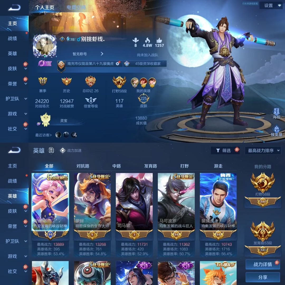 历史国服百强阿古朵,58段打野54段发育路,星域神启幽冥之眼天魔冰峰战神梅西252皮,不能加好友