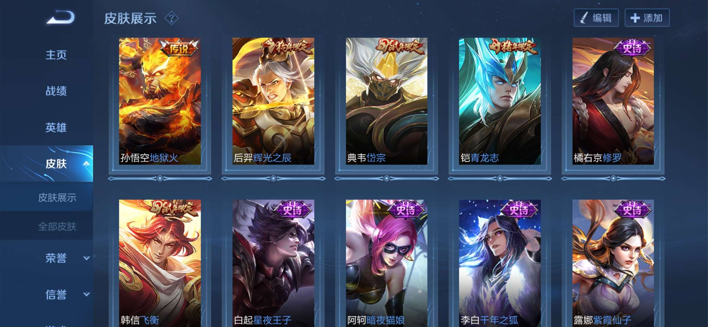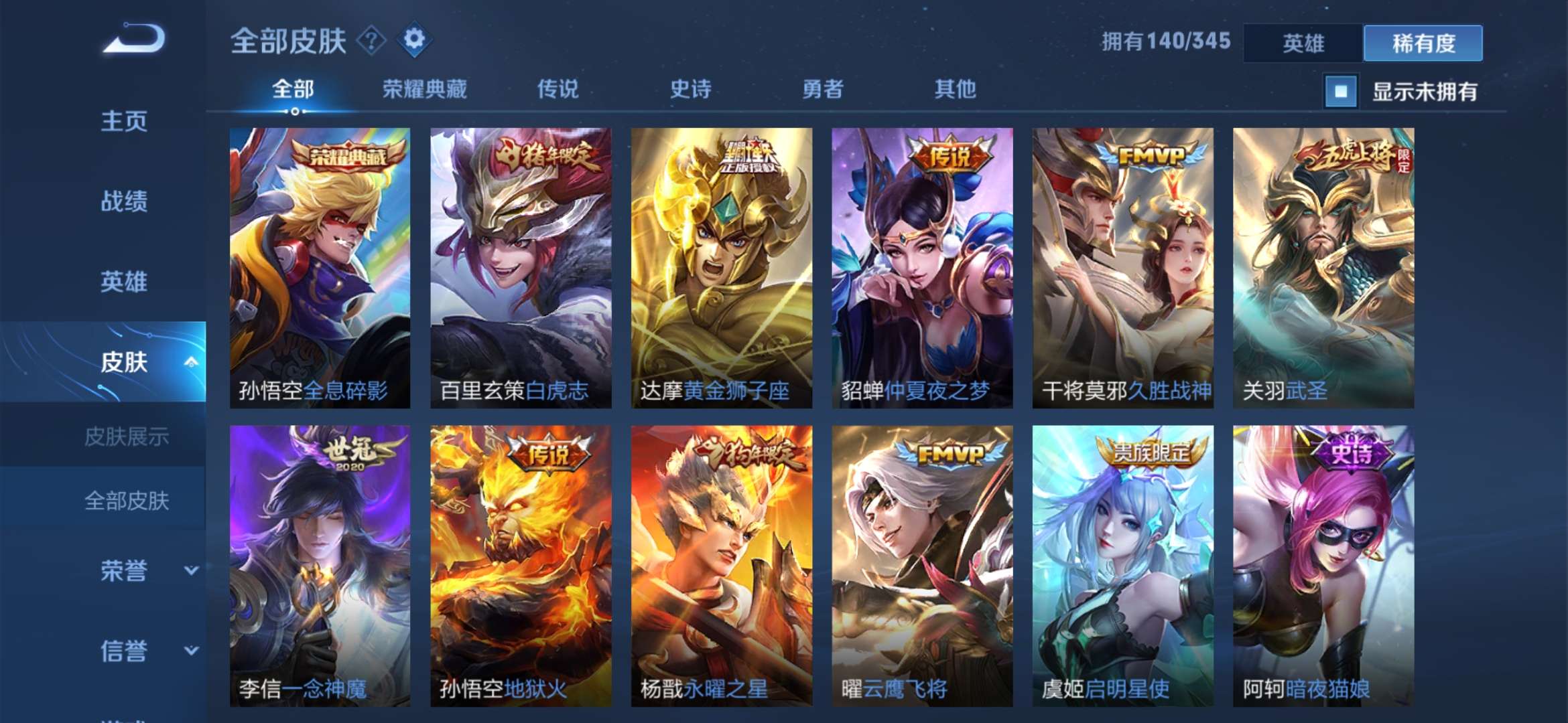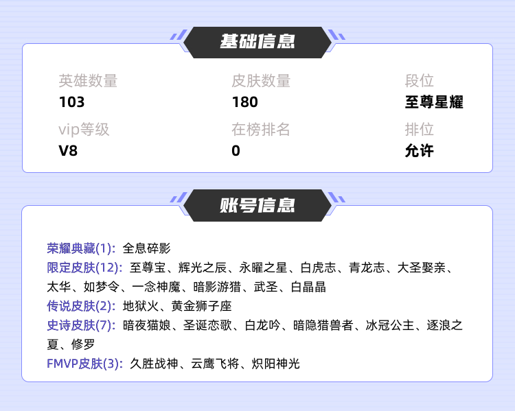 极品皮肤很多 猴子荣耀典藏全息碎影 白虎志 久胜战神 修罗 紫霞仙子 云鹰飞将 一念神魔 仲夏夜之梦 启明星使 永曜之星 辉光之辰…… 不要乱用东西 否则拉黑处理 祝你游戏愉快 满意可以给个好评哟