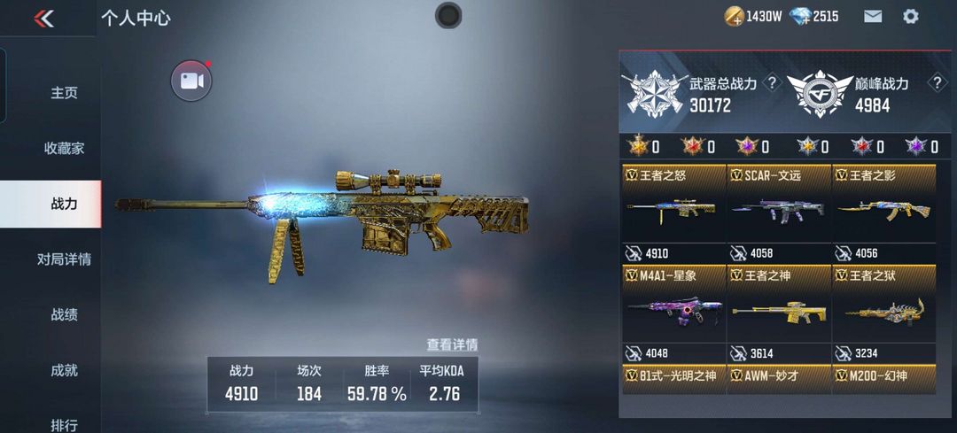 本游戏账号:英雄武器123个, 王者武器3个。拥有:复仇者,猎狐者,奥摩,等7个角色。装备齐全让你拥有完美游戏初体验,特殊装备有:尼泊尔-机械纪元、巴雷特-战龙、闪光弹-M4A1枪娘、闪光弹-金星、81式-阿波罗、AK47-血武士、COP 357-雷霆、M4A1-星象、AWM-妙才、手雷-竞界荣光、王者之神、地狱烈炎、巴雷特-毁灭、王者之影、黑骑士手雷、火麒麟手雷、黑骑士烟雾弹、王者之电、M4A1-蓝龙魂、巴雷特-安琪拉、AK47-心动次元、M200-幻神、源·左轮-黑武士、M200-心动次元、雷神闪光弹、98K-星神、QCW05-变形金刚·大黄蜂、沙鹰-超新星、关小雨、堕天使、等