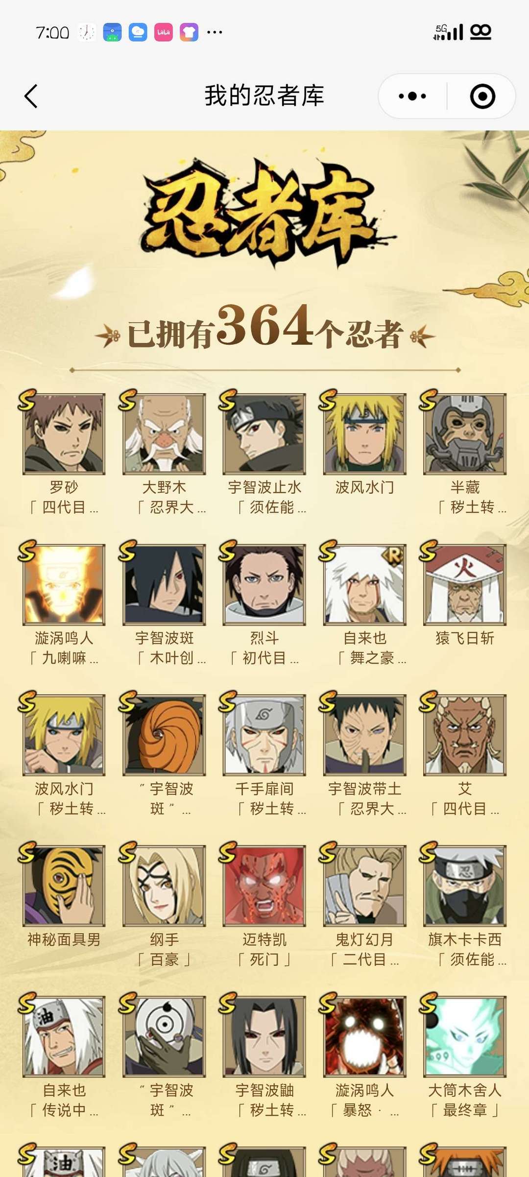 364忍 55s 2400w战力 已出带土 新迪 新罗 侠兜 须佐止水 有熊猫,全c忍