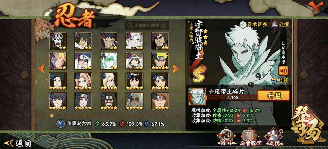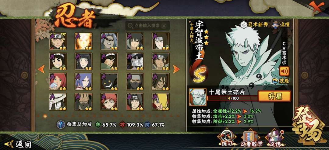 十尾带土、鸡翅、暴怒小孩、六尾鸣人、解斑黑绝、永恒佐、须佐卡、创立柱间、舍人、解活死斑、漂带、漂南、卑留呼、死门凯间