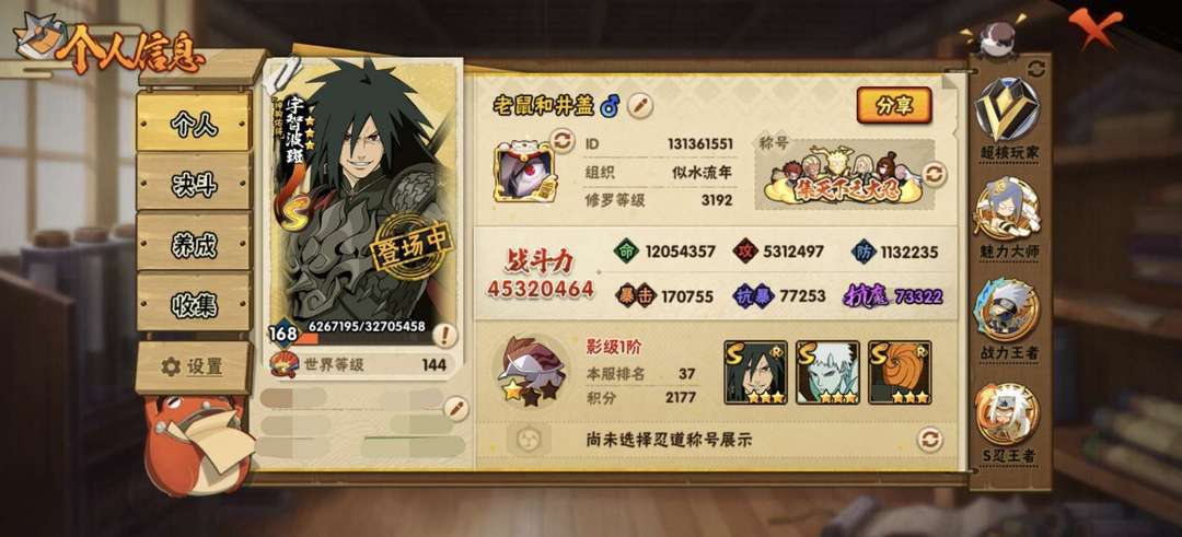 角色名:全忍者全通灵4532W战力