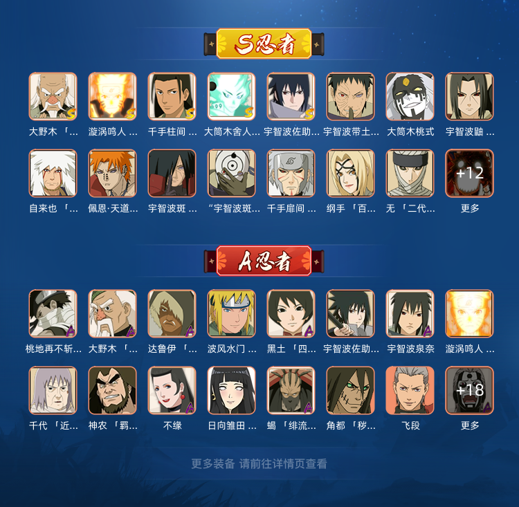 六尾 黄袁 永恒万话筒佐助 万话筒卡卡西 川蜀自来也 三忍自来也 百豪纲手 八门凯 百战水门 死水 死二 九尾水门 创立柱间 死斑 解斑 百战鼬死鼬 须佐止水 白面具 破面带土 忍战雷 忍战大野木 无 百战佩恩 天道超 舍人 桃式