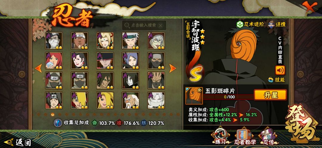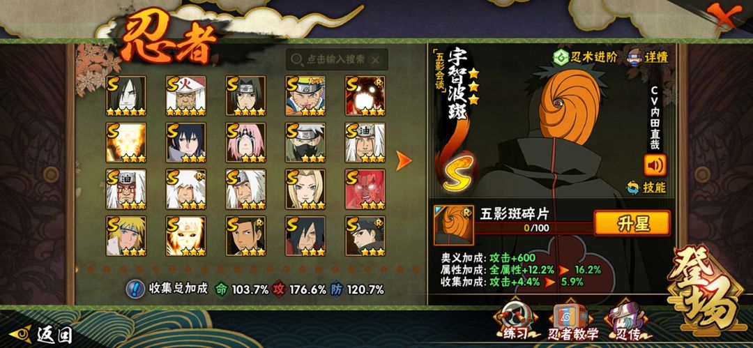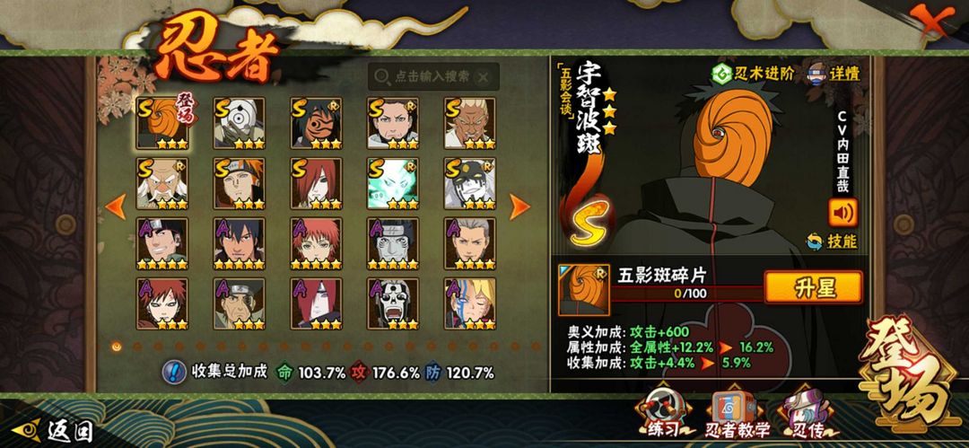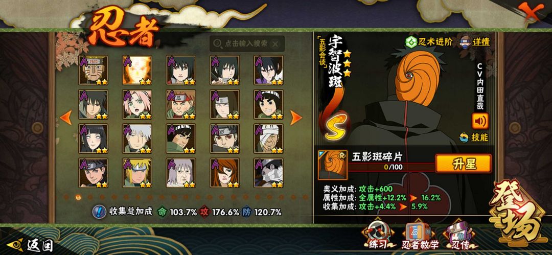 1822万战力,30个S 57个A。侠影纲手,漂泊佐助。秽土长门白面具。漂泊天道等精品忍者。