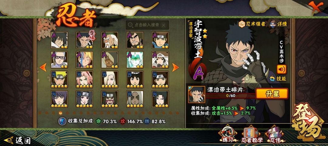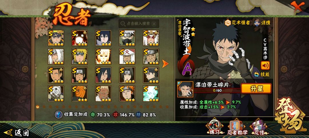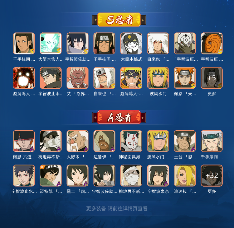 145级1131万战力,21个S忍,49个A忍,22个通灵(有熊猫),新号没多少忍者!请见谅!