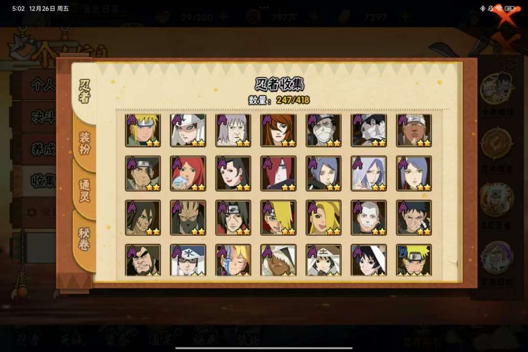 安卓q区1685万战斗力248忍者32S 52A 天道超,五影斑,金身水门,须佐卡卡西,六尾鸣人,漂泊带土,漂泊小南,等等