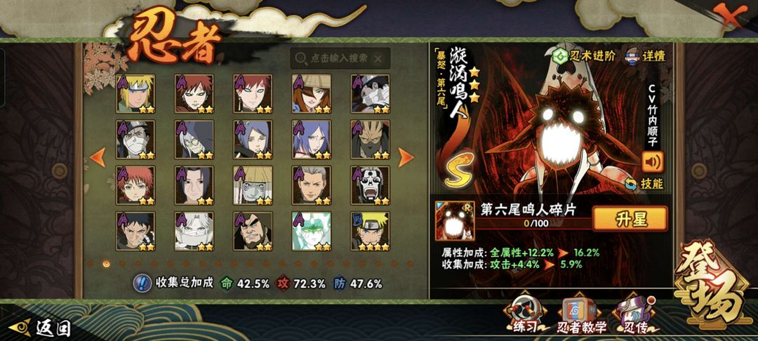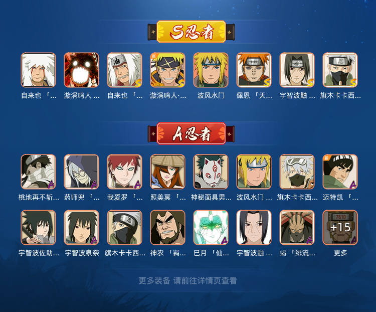 六尾鸣人,须佐卡,传说自来也,漂带和小南,夏日鼬,卑留呼,忍战卡,面麻,新春我爱罗,侠照,侠兜,泳卡等,还有许多高招