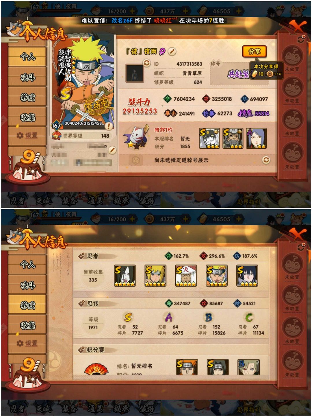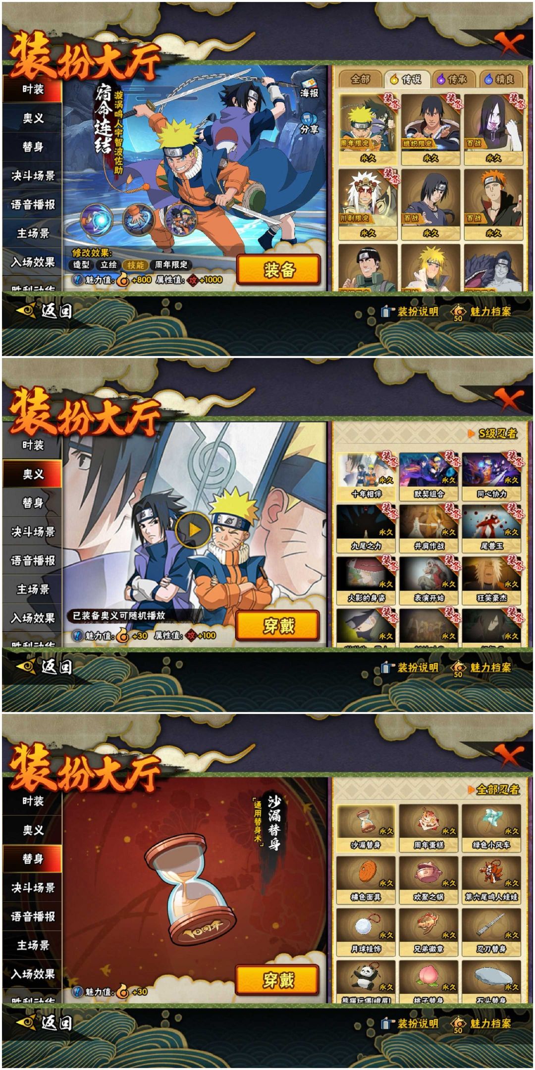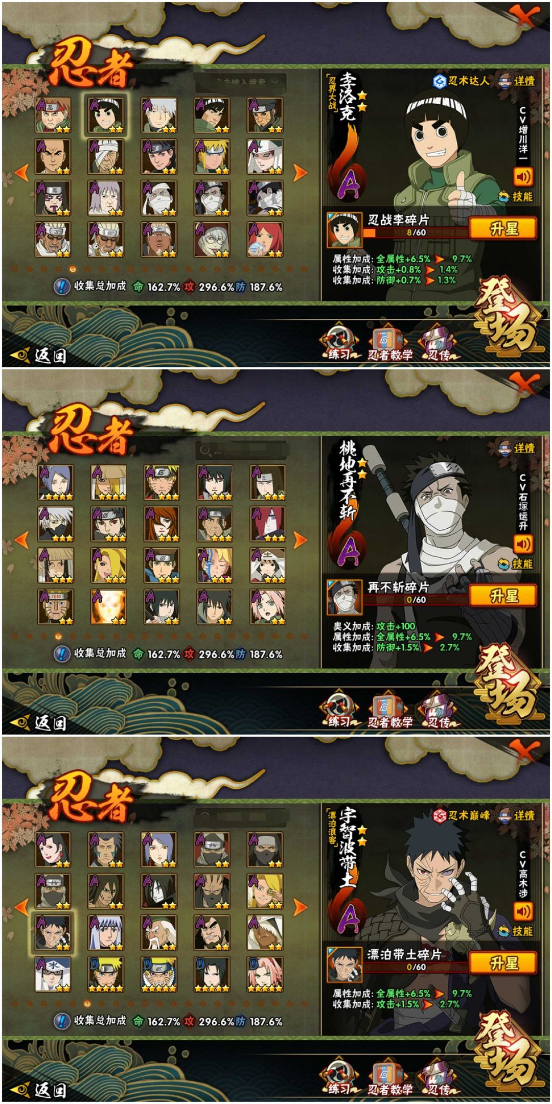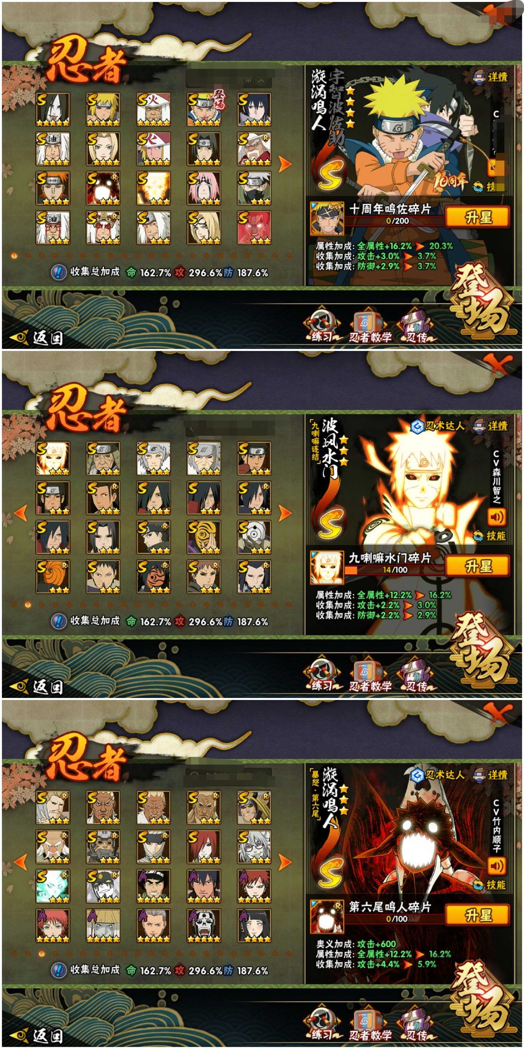 S忍者:带土「十尾人柱力」旗木卡卡西 「须佐能乎」;宇智波斑 「秽土转生·解」;漩涡鸣人 「暴怒·第六尾」;无 「二代目土影」;千手扉间;艾 「四代目雷影」;迈特凯 「死门」;千手扉间 「秽土转生」;佩恩 「天道」;大野木 「忍界大战」;半藏 「秽土转生」;波风水门 「秽土转生」;千手柱间;宇智波斑 「木叶创立」;猿飞日斩 「秽土转生」;长门 「秽土转生」;鬼灯幻月 「二代目水影」;宇智波鼬 「秽土转生」;宇智波佐助 「永恒万花筒」;大筒木桃式;波风水门;“宇智波斑” 「白面具」;宇智波斑;自来也 「仙人模式」;千手柱间 「木叶创立」;漩涡鸣人 「九喇嘛连结」;自来也 「舞之豪杰」;自来也 「传说中的三忍」;大蛇丸;宇智波鼬 「须佐能乎」;罗砂 「四代目风影」;宇智波斑 「秽土转生」;宇智波带土 「忍界大战」;宇智波斑 「五影会谈」;波风水门 「九喇嘛连结」;神秘面具男;大筒木舍人 「最终章」;艾 「忍界大战」;宇智波止水 「须佐能乎」;纲手 「百豪」;千手柱间 「秽土转生」;春野樱 「忍界大战」;金角银角 「秽土转生」;大野木 「三代目土影」;药师兜 「仙人模式」;神秘面具男 「红夜