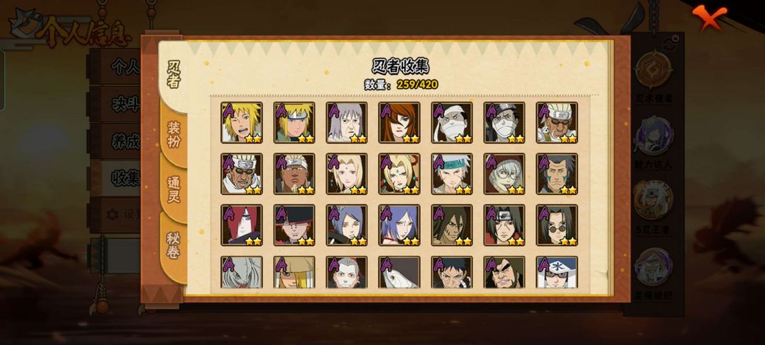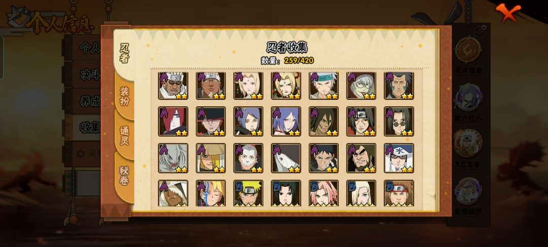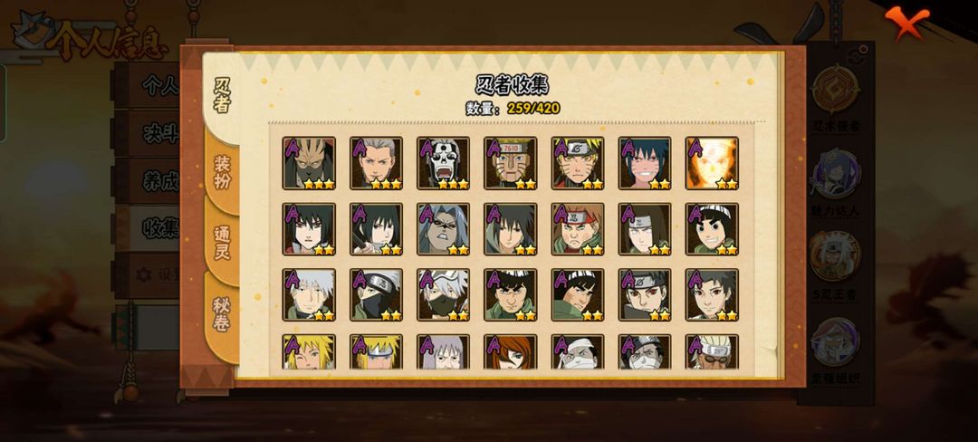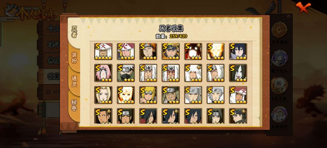 S忍42个A忍58个,有熊猫加螃蟹霸体11级,战力1800万,罗莎往后的忍法帖都有