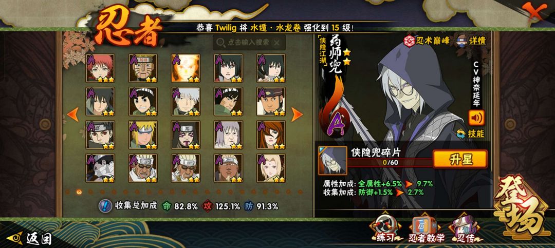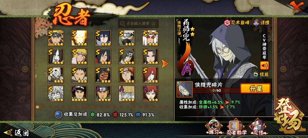 16S,46A,209忍,忍战带土,仙人兜,解斑,漂泊带土,熊猫,蛞蝓,侠隐兜,七夕阿斯玛,长门,新春鼬,须佐卡卡西,忍战卡卡西