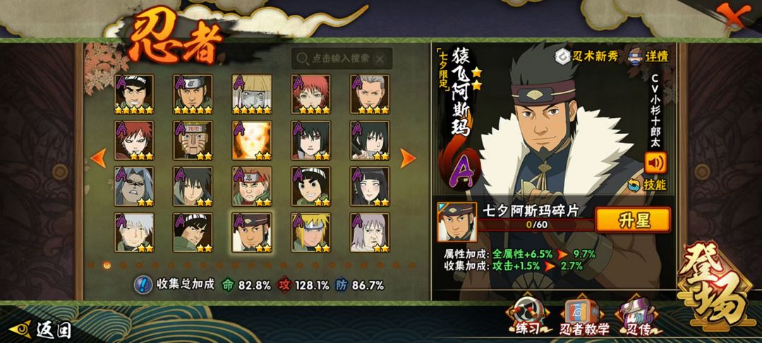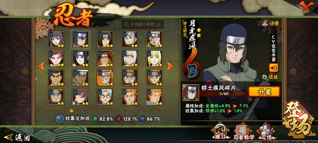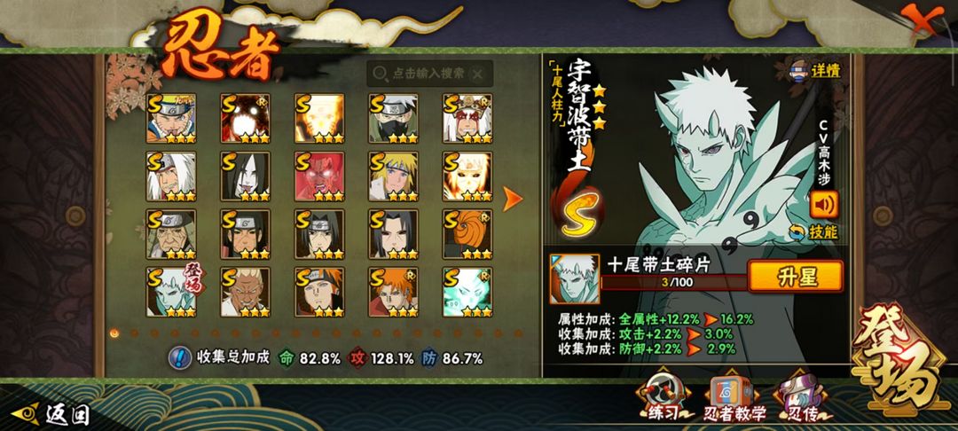 十尾人柱力带土 九喇嘛联结波风水门 九喇嘛联结漩涡鸣人 须佐卡卡西 秽土柱间 秽土三代 死门凯 三忍自来也 忍者雷 六尾鸣人 天道超 大筒木舍人 秽土鼬 五影会谈班 爱情哥 疾风传咒印佐助