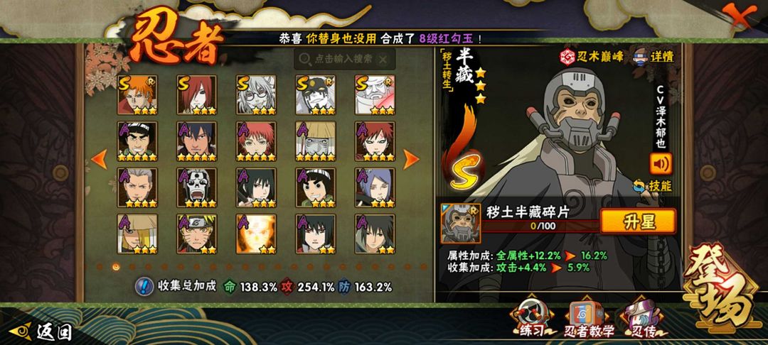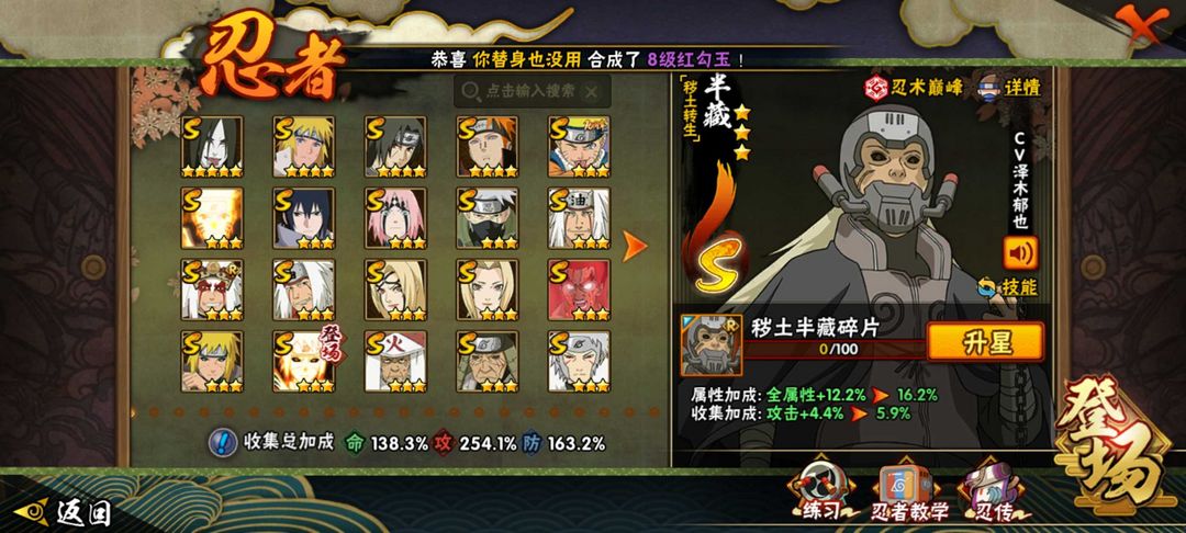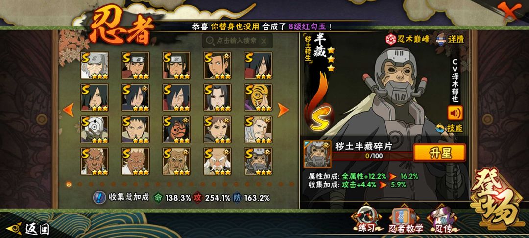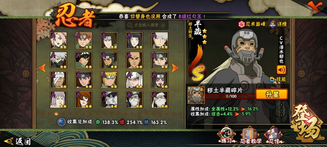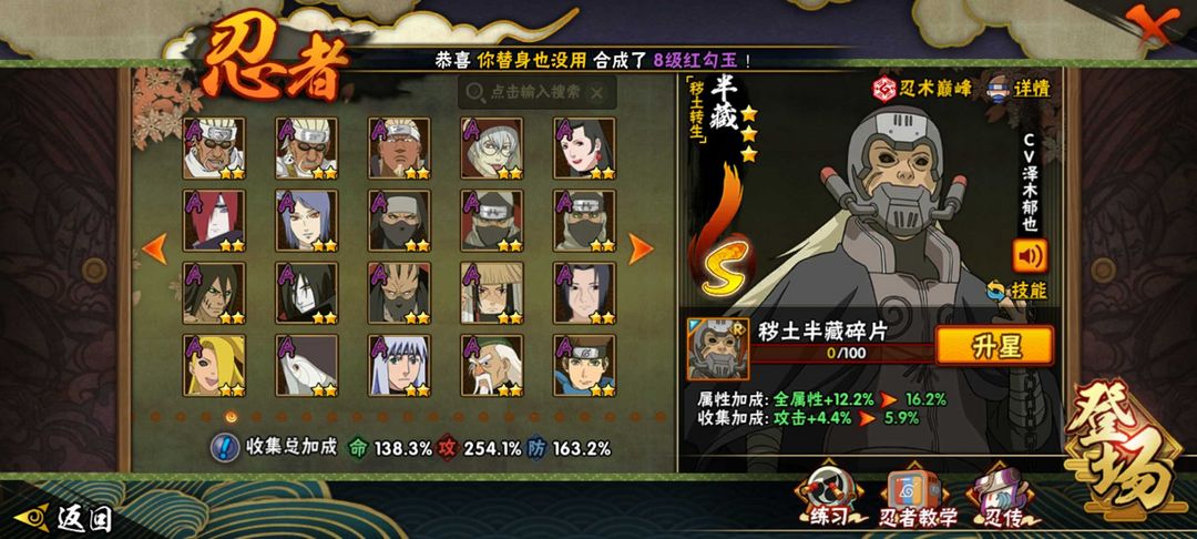 全高招号,有绝大部分忍法帖如超哥,金式,小胡子,桃式等 有暴怒带土等A忍 决斗场有熊猫,蓝猫