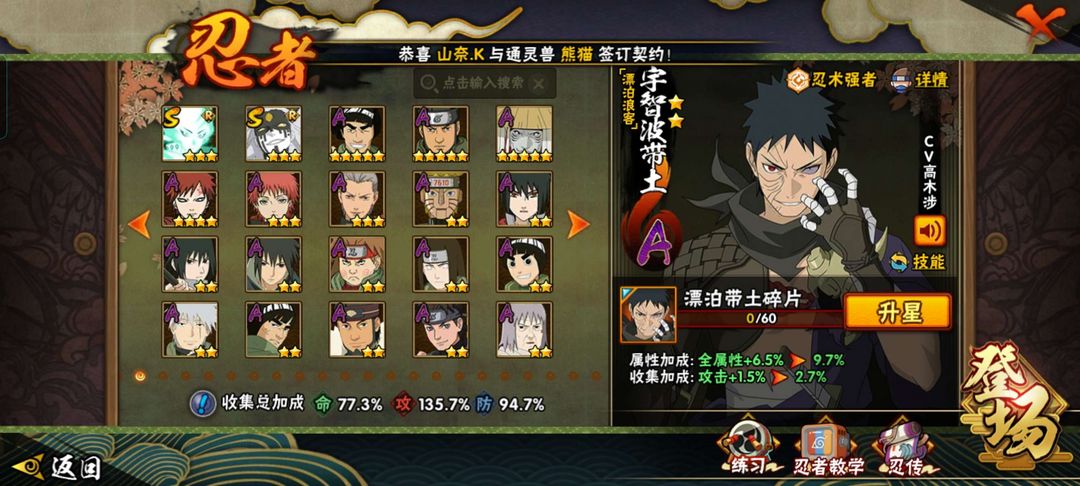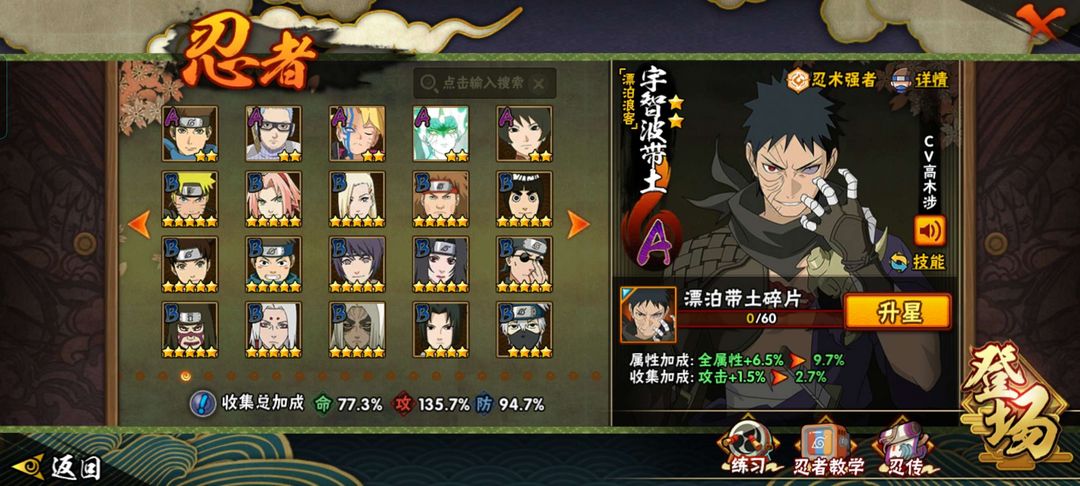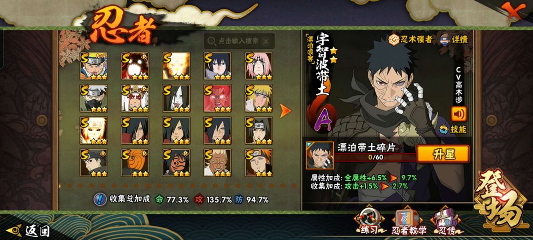 忍战带土、面麻、天道超、漂泊扉间、宇智波斑(须佐能乎)、千手柱间(秽土转生)、波风水门(九尾模式)、宇智波鼬(秽土转生)、长门(天道)、宇智波止水(瞬身)、大筒木辉夜、大筒木羽衣、六道鸣人、六道佐助、宇智波佐助(终末之谷)、千手扉间(秽土转生)、三代火影(猿飞日斩)、纲手(百豪之术)、自来也(仙人模式)、宇智波带土(外道魔像)