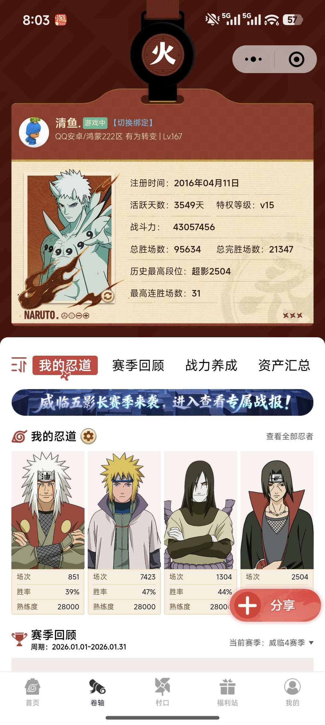 ❤️ 全忍者,全通灵,全场景,可秒团本,各种648奥义,商城奥义图,替身全清完!❤️如果有什么问题可以给我发信息,我看到一定会在第一时间回复各位租客的问题。(排位什么的随便打,如果要加朋友什么的好友也可以随删)