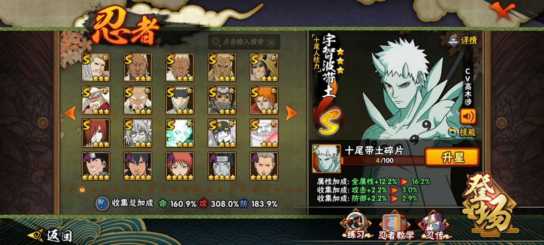 S忍:最新高招s六道带土、九喇嘛水门、传说自来也、须佐卡卡西、忍战雷影、宇智波斑解、创立柱间、永恒万花筒佐助、忍战小樱、九喇嘛鸣人、八门凯、忍战带土、创立斑、秽土柱间、罗莎(四代目风影)宇智波鼬(秽土转生)、艾、药师兜(仙人模式)、天道超、佩恩、秽土系列全部都有、波风水门、白面具、大野木、大蛇丸、舞之豪杰自来也(川剧限定皮肤也有)、仙人自来也、普通自来也、千手柱间、大蛇丸、面具男、鬼灯幻月、纲手、百豪、长门。