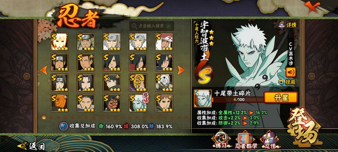 A忍:绯流琥蝎、漂泊带土、忍战小李、桃式博人、日向宁次忍界大战、博人传长十郎、青年长门、漂泊佩恩六道、青年雷影、新春迪达拉、侠影江湖照美冥、青年水门、面麻、夏日泳装卡卡西、暴怒带土、黑土(博人传)、漂泊二代、奇拉比、忍战奇拉比、仙人鸣人、宇智波止水、万花筒佐助、秽土迪达拉、泳装小南、晓大蛇丸、忍界勘九郎、宇智波鼬、迪达拉大部分忍者都有,具体如图。