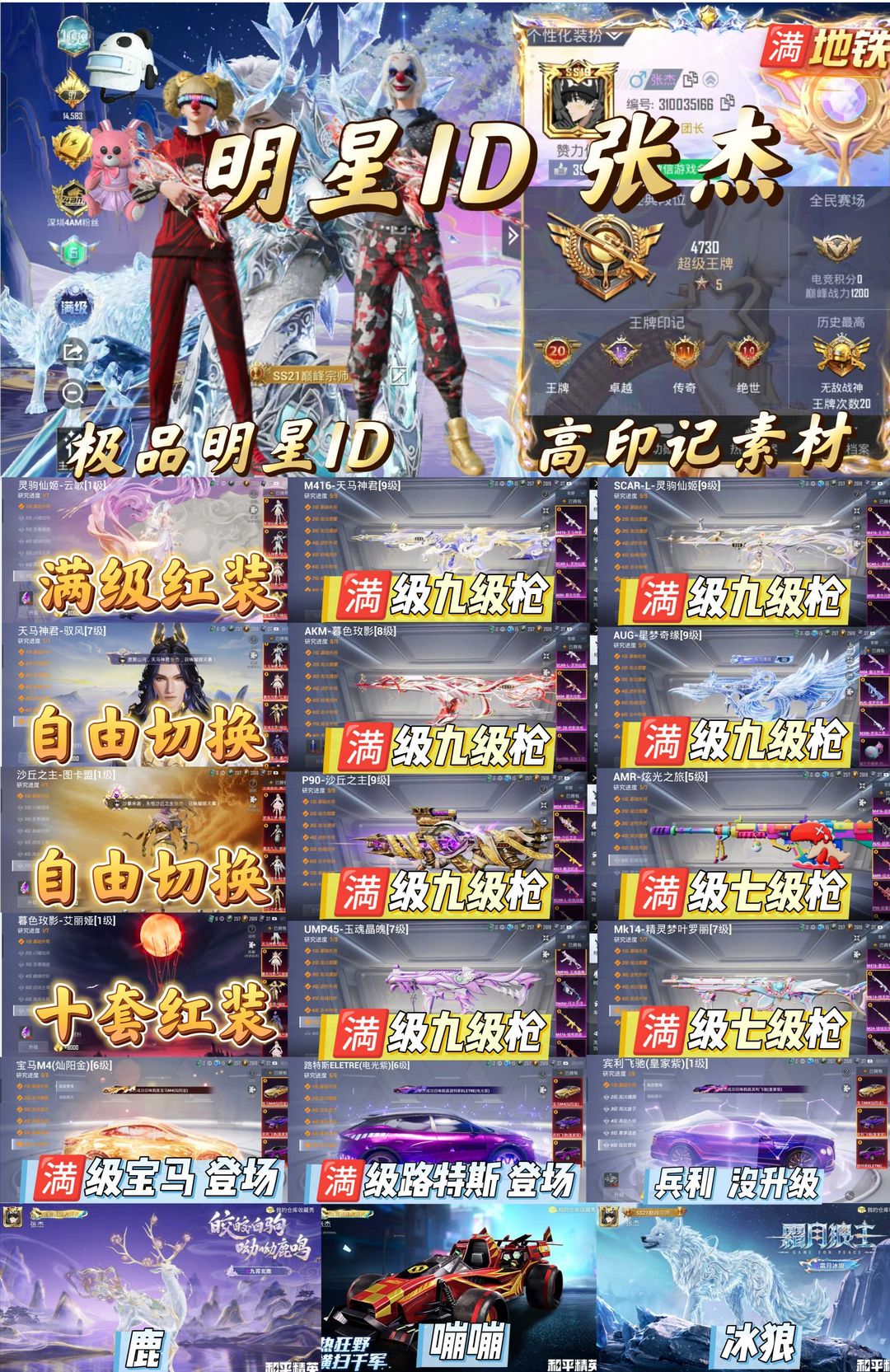 明星ID张杰/满级月霜狼/云歌/驭风/天马神君/灵驹仙姬/星梦奇缘/暮色/宝马M4/小丑/雪国/玄鹿