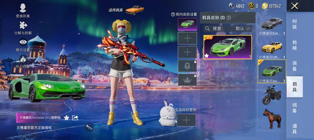 巧克力火箭少女蓝口罩黄螳螂小丑鱼花火奇异狩猎金鞋等热门皮肤兰博基尼轿车跑车越野车
