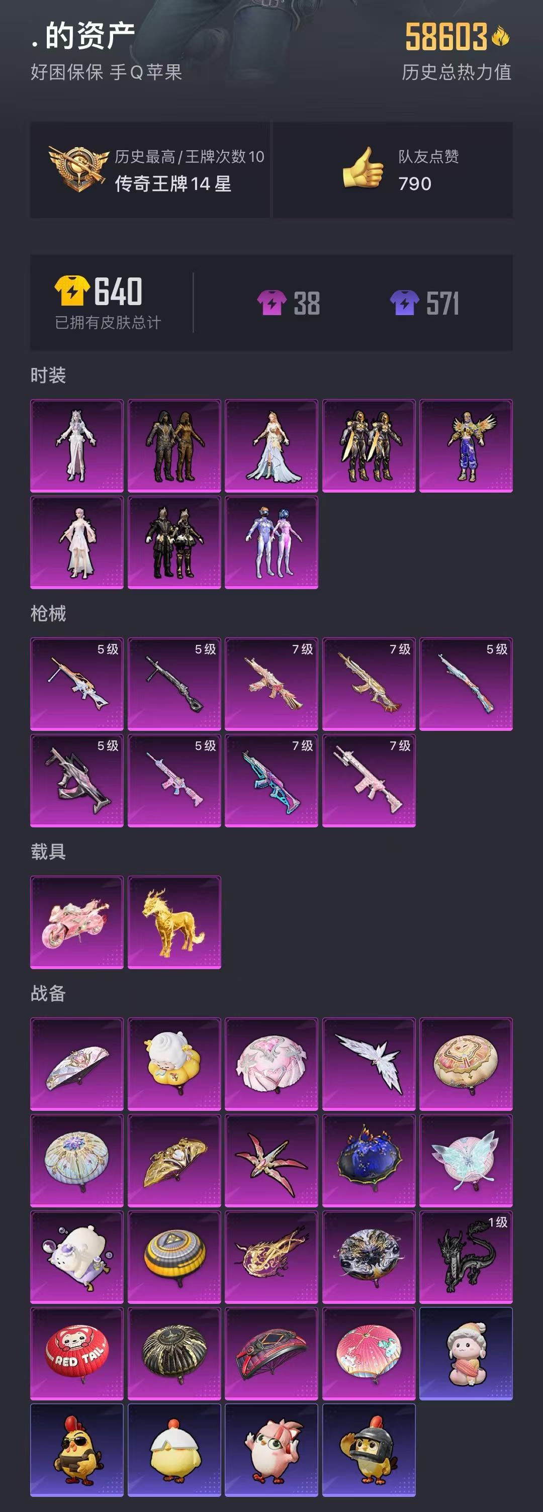 【稀有资产】套装-派对舞王/套装-粉红小猪/套装-龟仙人/玩偶服-卖崽青蛙/玩偶服-美羊羊/玩偶服-喜羊羊/角色-时希公主/角色-银尘/角色-海琴烟 【粉色套装】套装-梦幻火箭/套装-暗夜鎏金/角色-烟云彩露/角色-光极星/套装-繁龙极客/套装-创世·救赎/角色-智耀战神/角色-冷漠罗丽 【粉色枪皮】AKM-梦之光华[7级]/GROZA-镜光银凌[5级]/M416-电玩时刻[5级]/M762-鬼刀[7级]/Kar98K-巳巳如意[5级]/M417-第五大道[7级]/AKS-74U-星穹咏叹调[7级]/MG-36-沧焰双生[5级]/DP-28-豹影疾电[5级] 【载具】护世瑞兽/盛世惊鸿摩托车 【飞行器】镜光幻境飞行翼/万象金身飞行器/龙翔九天飞行器[1级]/酣梦熊熊飞行器/祥瑞起舞飞行器 【珍稀背包】洛神天依背包3级/ 禁止利用账号进行开挂、使用辅助违规软件诈骗等违规操作。 喜欢本账号请点 ☆收藏☆ 方便下次租用,谢谢光临惠顾! 毁号行为涉及毁坏虚拟财产罪及计算机安全罪,请文明游戏素质游戏,让我们共建美好租号平台! 请游戏局内保持文明,防止禁言影响他人游戏,祝您玩得愉快!