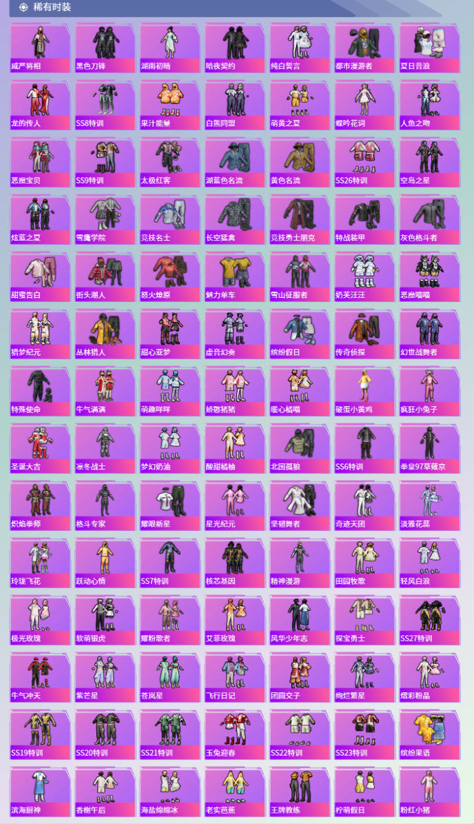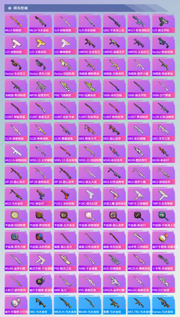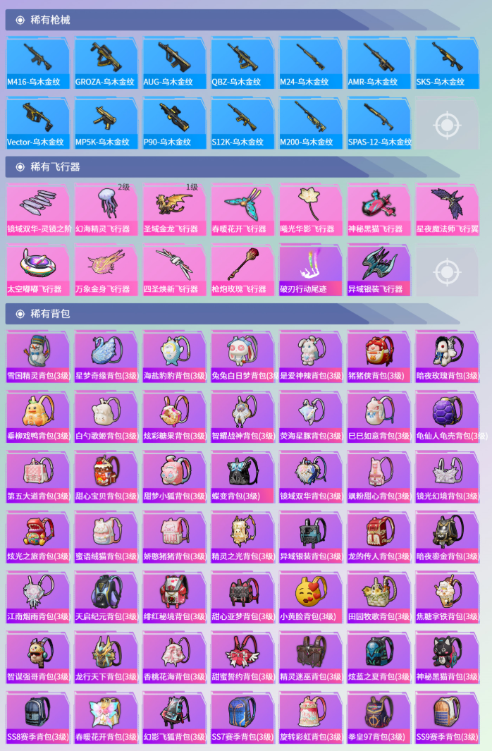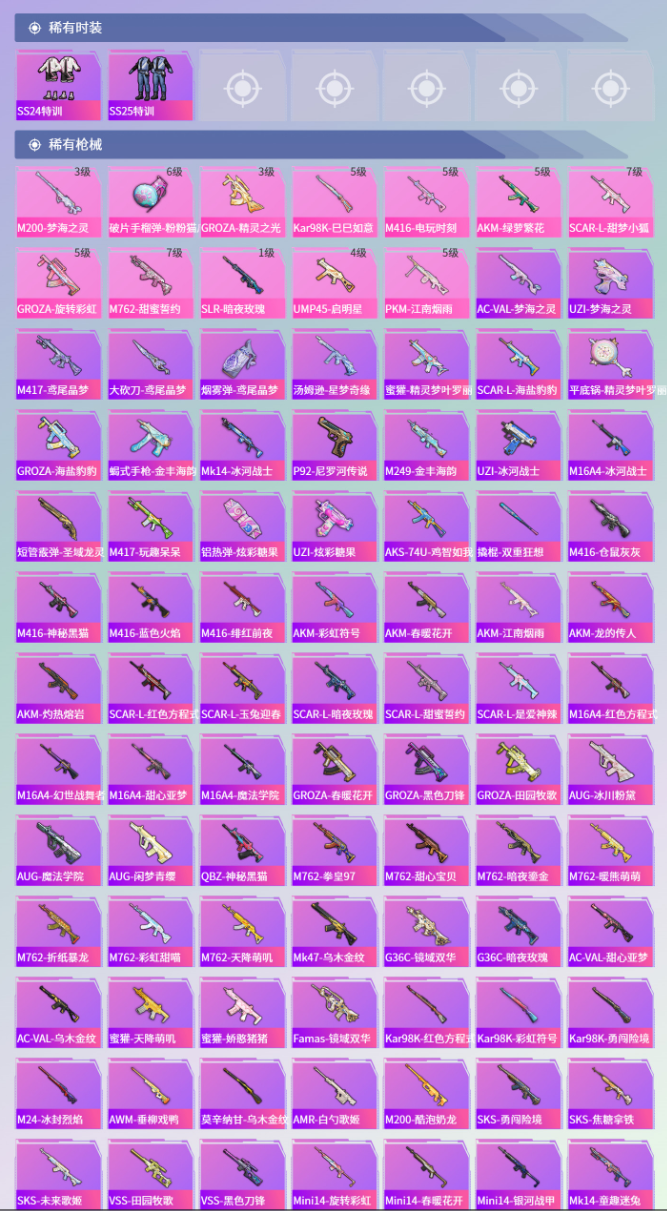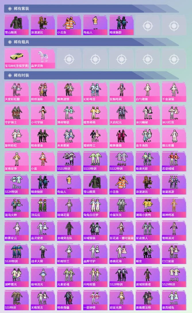 【23粉装】角色-狂魅哈莉,角色-白勺歌姬,套装-冰川幽秘,套装-暖熊萌萌,套装-幻彩电音,角色-呆萌星弥,角色-烟云彩露,套装-天启纪元,套装-金丰海韵,角色-千金淑猫,套装-天使彩虹糖,套装-蝶舞迷情,套装-暗夜鎏金,角色-小可学妹,套装-蜜桃特工,套装-守护骑士,套装-缤纷油彩,套装-旋转彩虹,套装-蝶舞蔷薇,套装-薄荷物语,套装-未来歌姬,套装-冰川红玫,角色-小蓝 【12特效枪】GROZA-旋转彩虹/5级,GROZA-精灵之光/3级,Kar98K-巳巳如意/5级,M762-甜蜜誓约/7级,M200-梦海之灵/3级,PKM-江南烟雨/5级,破片手榴弹-粉粉猫爪/6级,UMP45-启明星/4级,SCAR-L-甜梦小狐/7级,AKM-绿萝繁花/5级,M416-电玩时刻/5级,SLR-暗夜玫瑰/1级 【5稀有紫装】雪山精英,浪漫波比,小丑鱼,龟仙人,暗夜魅影 【2稀有载具】宝马M4(圣保罗黄),晶梦灵驹