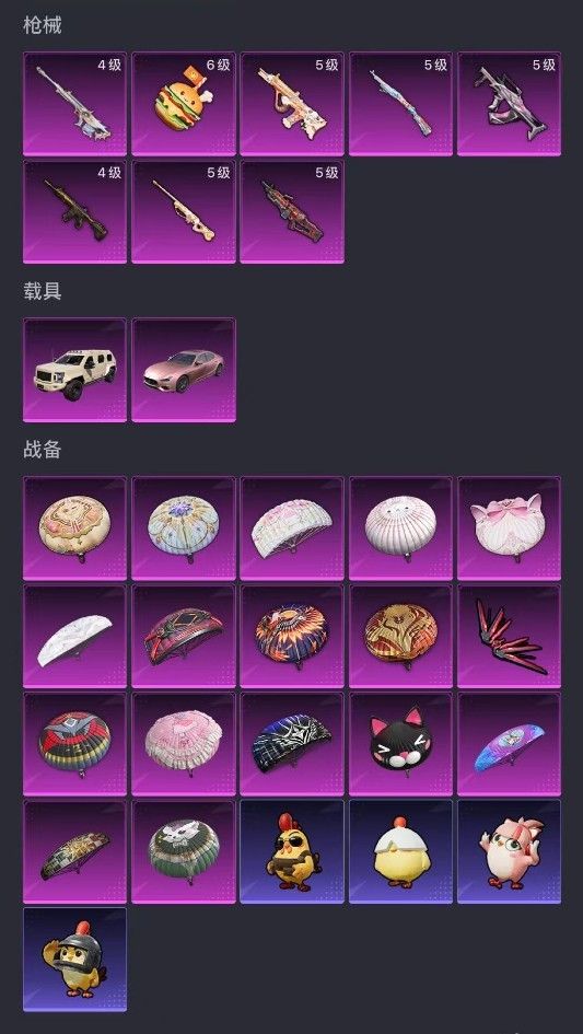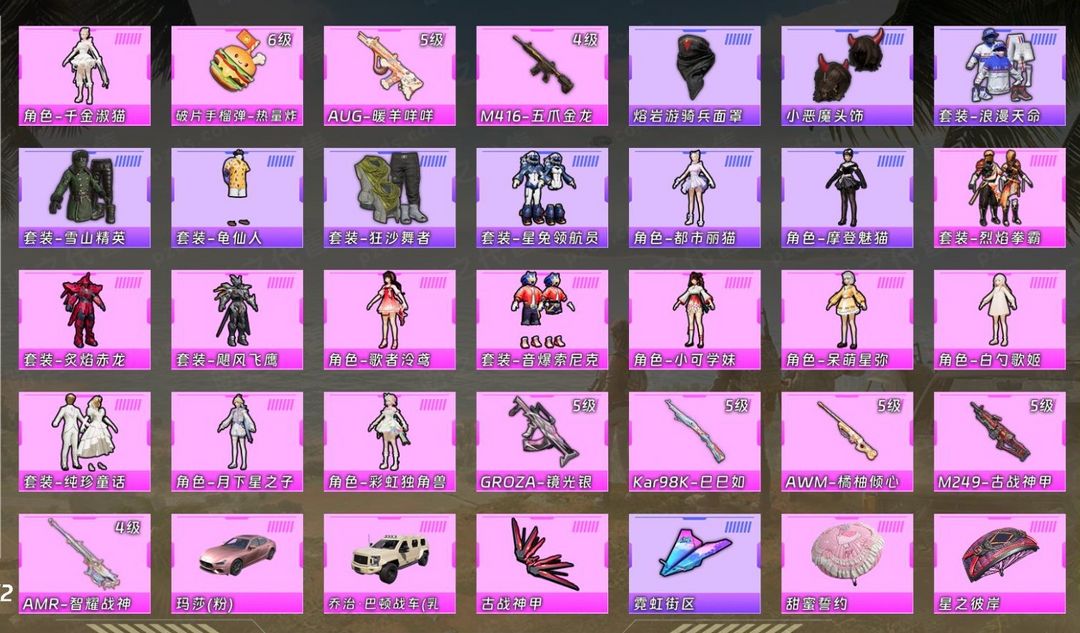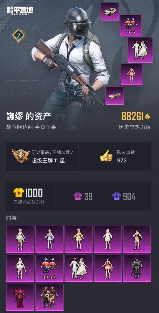 【热力值】88261【历史最高段位】超级王牌11星【王牌印记】7【稀有资产数量】13【套装数量】226【枪械数量】263【粉枪械数量】8【粉套装数量】12【载具数量】2【飞行器数量】2 【稀有资产】角色-千金淑猫/破片手榴弹-热量炸弹[6级]/AUG-暖羊咩咩[5级]/M416-五爪金龙[4级]/熔岩游骑兵面罩/小恶魔头饰/套装-浪漫天命/套装-雪山精英/套装-龟仙人/套装-狂沙舞者/套装-星兔领航员/角色-都市丽猫/角色-摩登魅猫 【粉色套装】套装-烈焰拳霸/套装-炙焰赤龙/套装-飓风飞鹰/角色-歌者泠鸢/套装-音爆索尼克/角色-小可学妹/角色-呆萌星弥/角色-白勺歌姬/套装-纯珍童话/角色-月下星之子/角色-彩虹独角兽 【粉色枪皮】GROZA-镜光银凌[5级]/Kar98K-巳巳如意[5级]/AWM-橘柚倾心[5级]/M249-古战神甲[5级]/AMR-智耀战神[4级] 【载具】玛莎拉蒂Ghibli(粉)/乔治·巴顿战车(乳石白) 【飞行器】古战神甲飞行器/霓虹街区飞行器 【珍稀背包】洛神天依背包(2级)/
