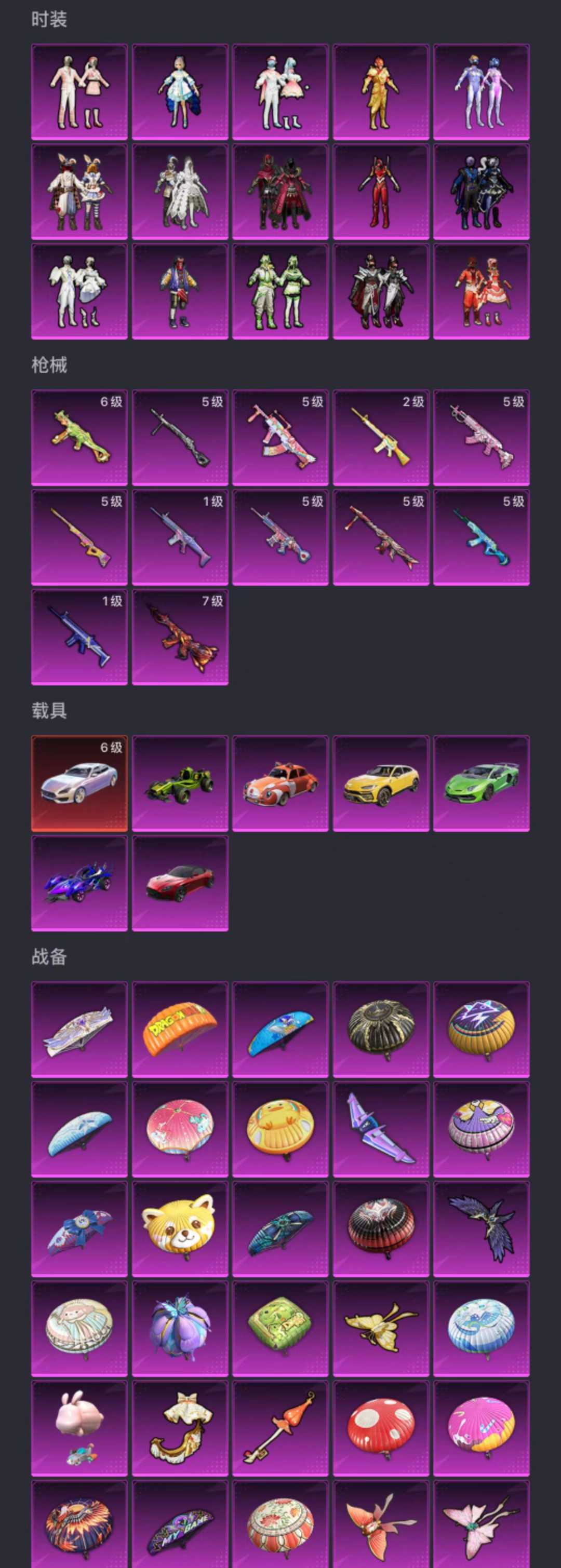 6级玛莎拉蒂⭐️小熊猫马丁龙骨兰博基尼⭐️奇异狩猎者小丑鱼红螳螂洛天依梦幻火箭冰霜白皇⭐️12特效枪