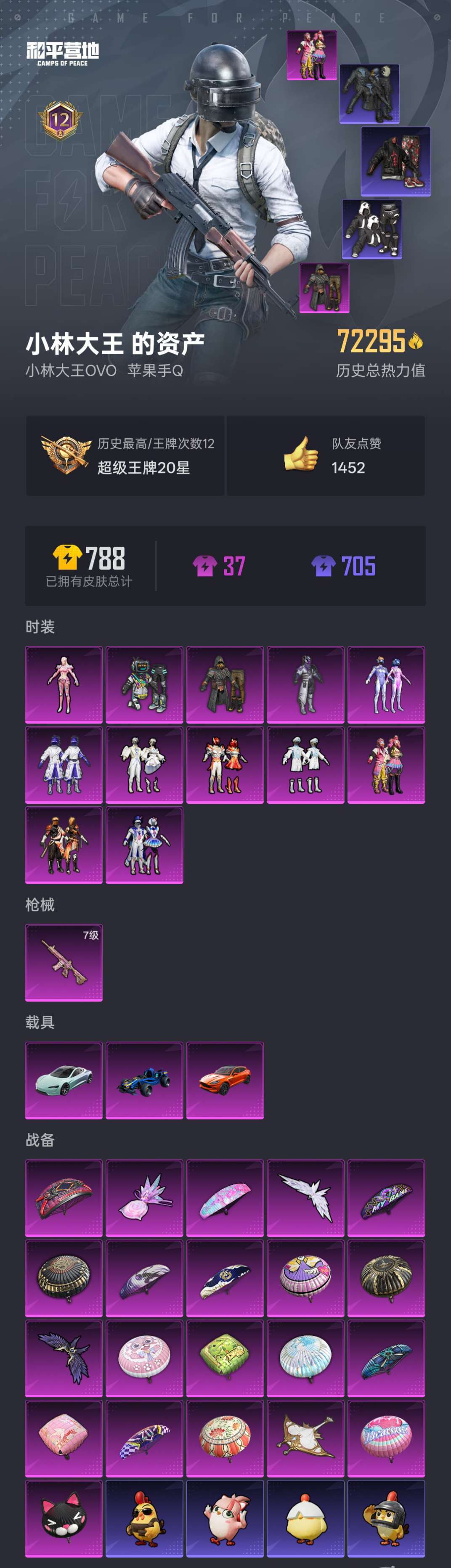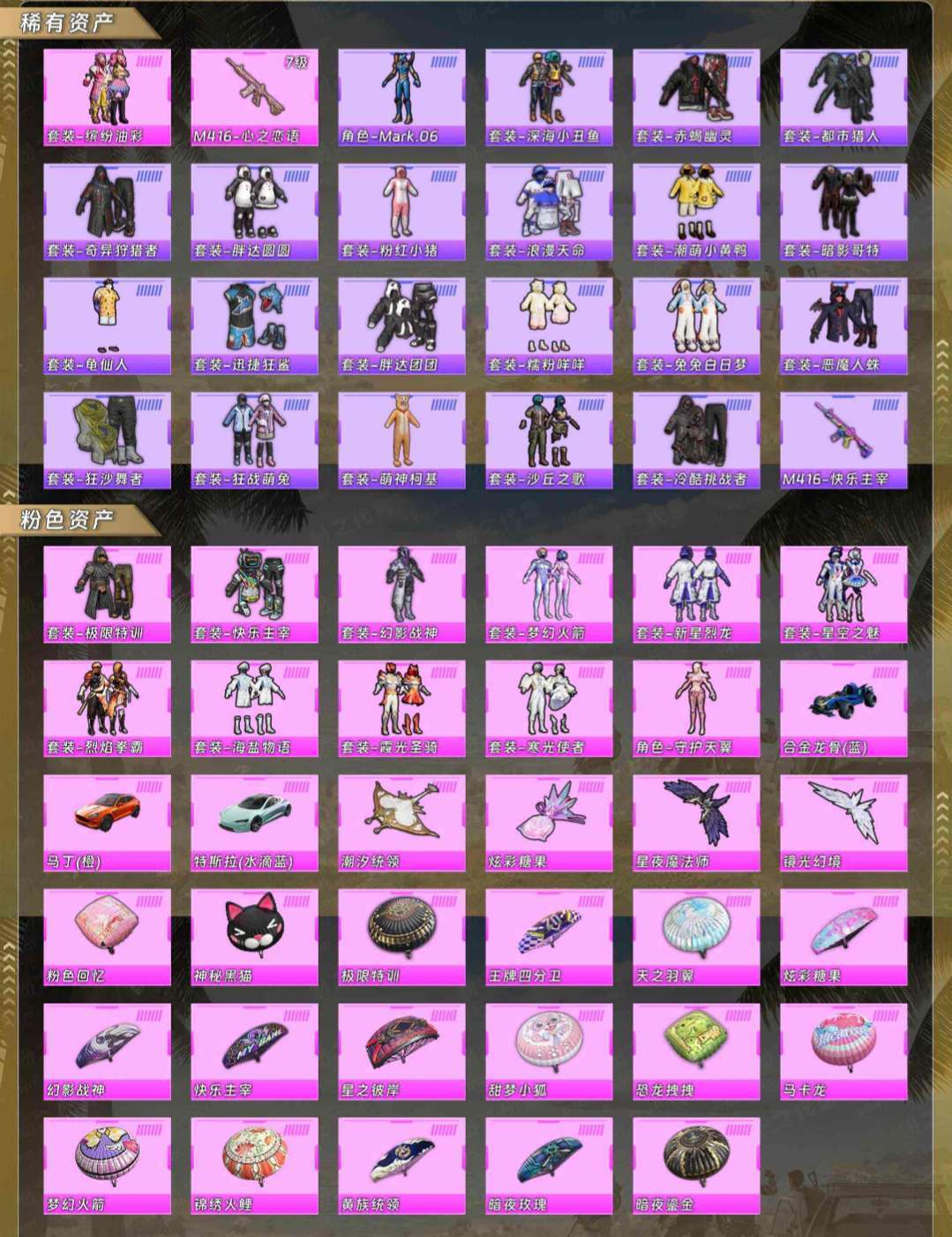 12粉装1升级枪3载具⚡7万热力⚡蓝螳螂⚡梦幻火箭⚡满级心之恋语⚡特斯拉马丁合金龙骨