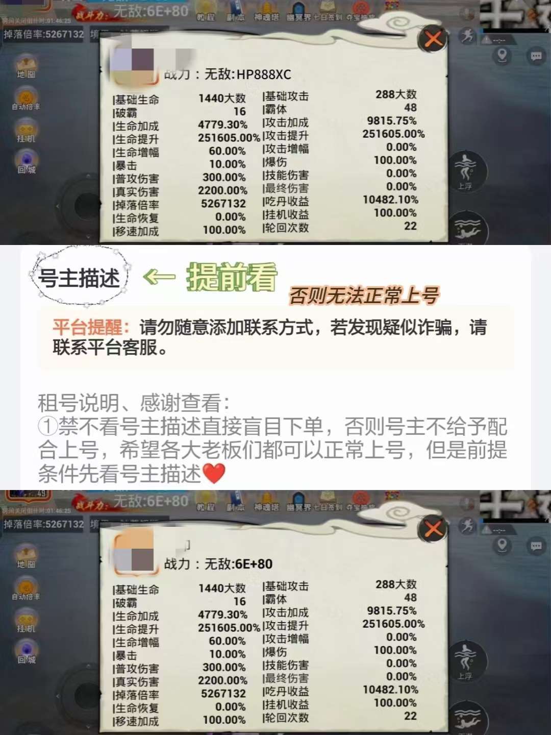 租号说明:重点查看 禁止使用号上的交易牌.点券.仙髓.倍率丹.不可乱点免费轮回.否则必追究法律责任 ❤️❤️重点查看:无敌战力~图②~+《战力:无敌:HP》 ❤️❤️重点查看:无敌战力~图②~+《战力:无敌:HP》 ❤️❤️重点查看:无敌战力~图②~+《战力:无敌:HP》 禁止非法组队 开挂 等一系列 导致账号无法使用 我们有权利要求并赔偿一切损失