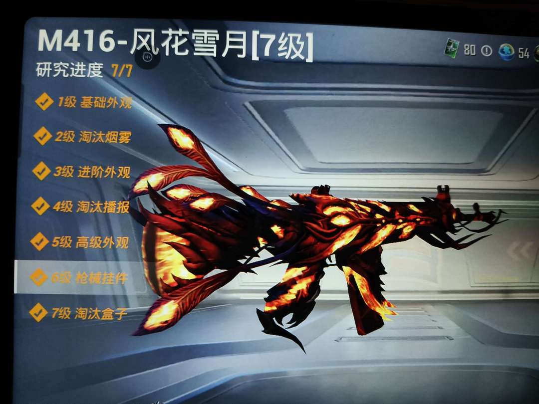 风花雪月和大盘鸡暗夜流金两个全满级满配件,小丑鱼加三件粉套,加乌鸦头,基本上每把枪都有皮肤