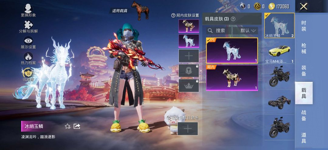 有一个三级小猫,和一个一级敖丙,有都市猎人,极限特训,深海小丑鱼,猪脸,两匹马和一台宝马m4