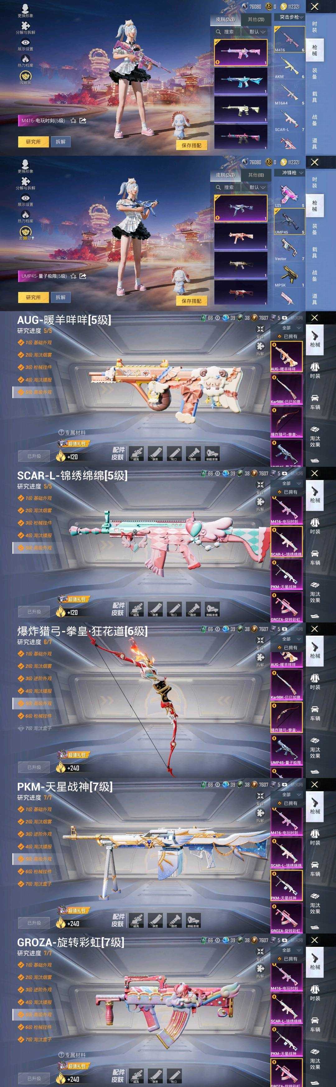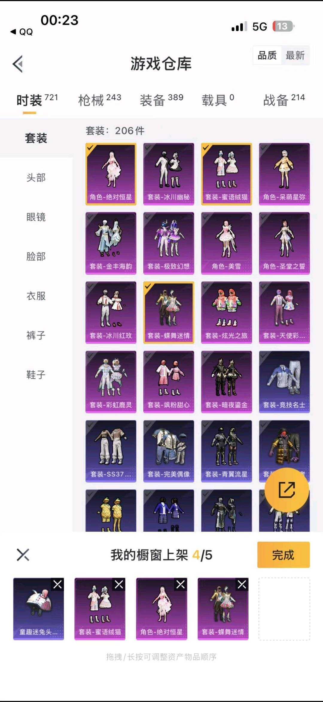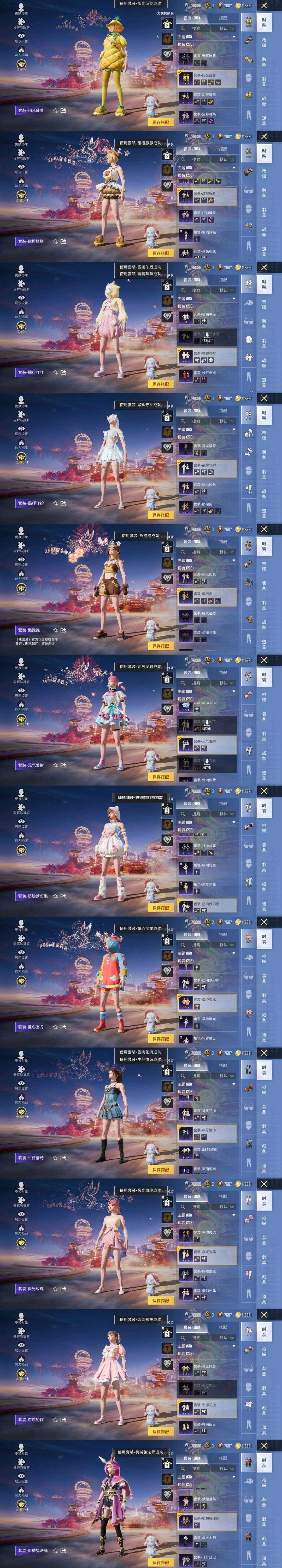 15粉,0载具,8特效枪,206套装,14王牌印记 女号 公主号 妹子号 女神号 衣柜号 妹妹号 阳光菠萝 甜橙豚豚 糯粉咩咩 元气发射 蝴蝶眼罩 梦幻奶油熊 熊抱抱 童心宝龙 牛仔服 机械兔法师